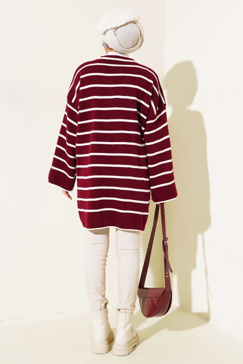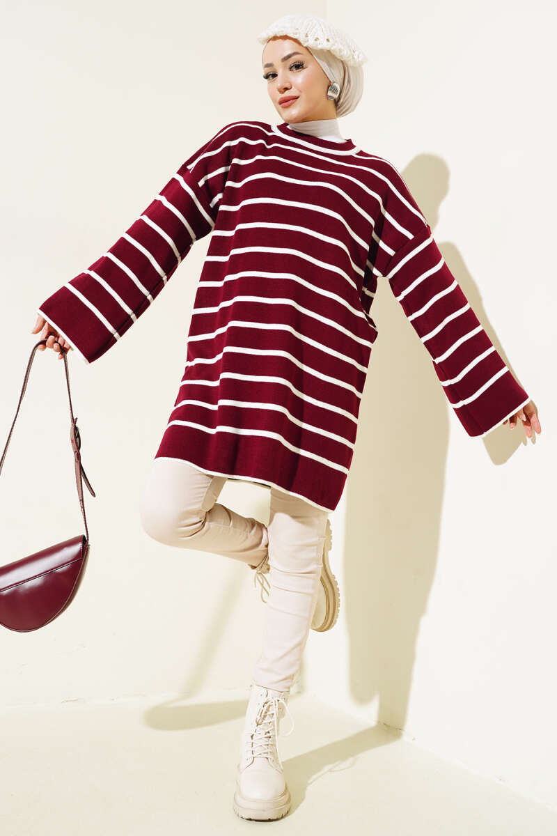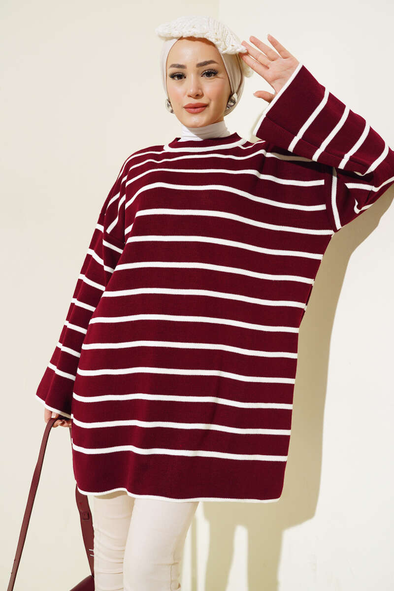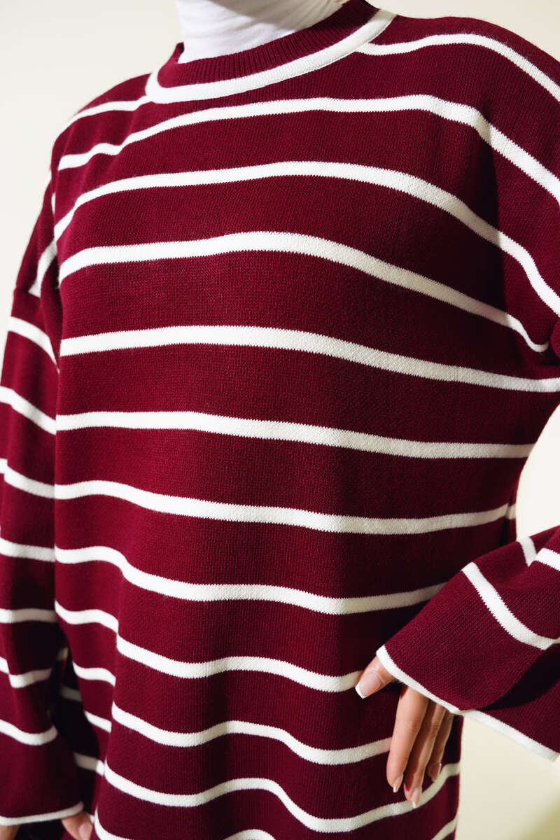 Yatay Çizgili Düşük Omuz Triko Tunik Bordo