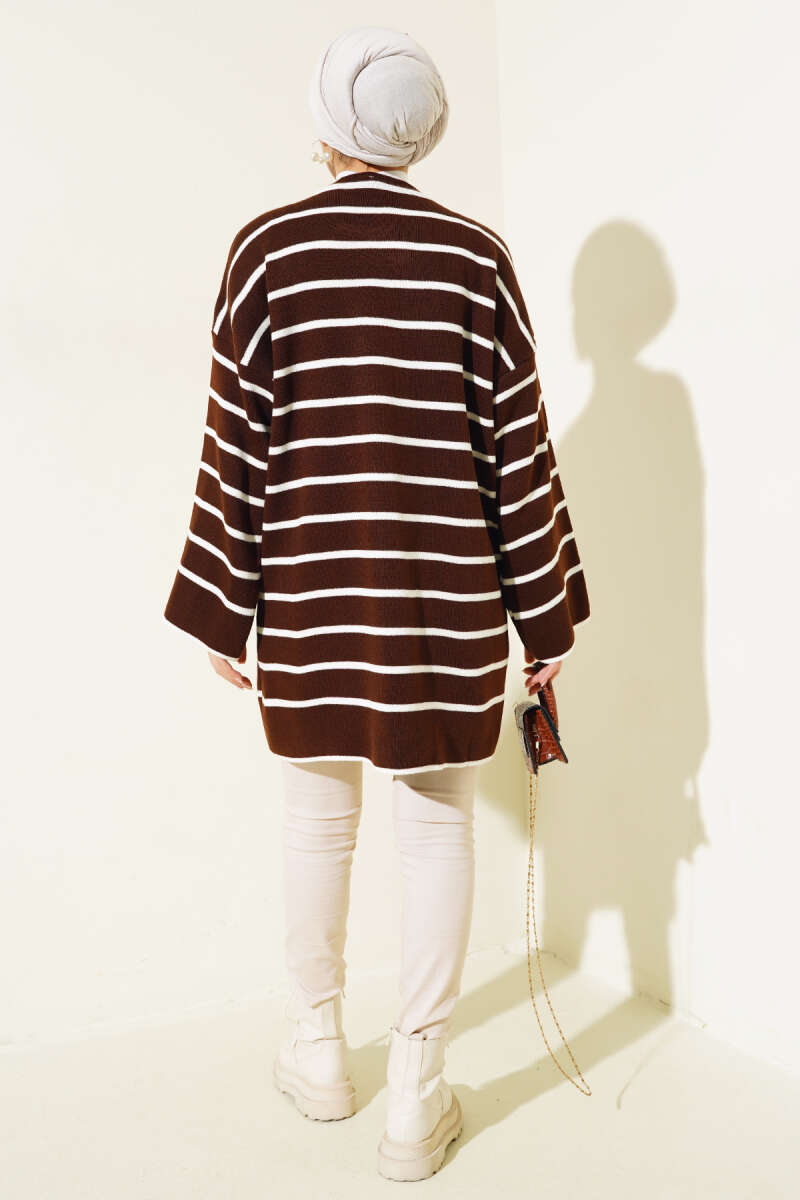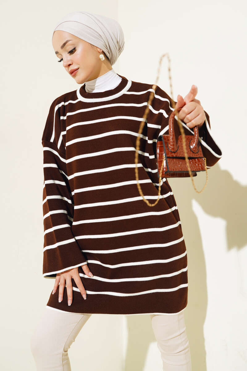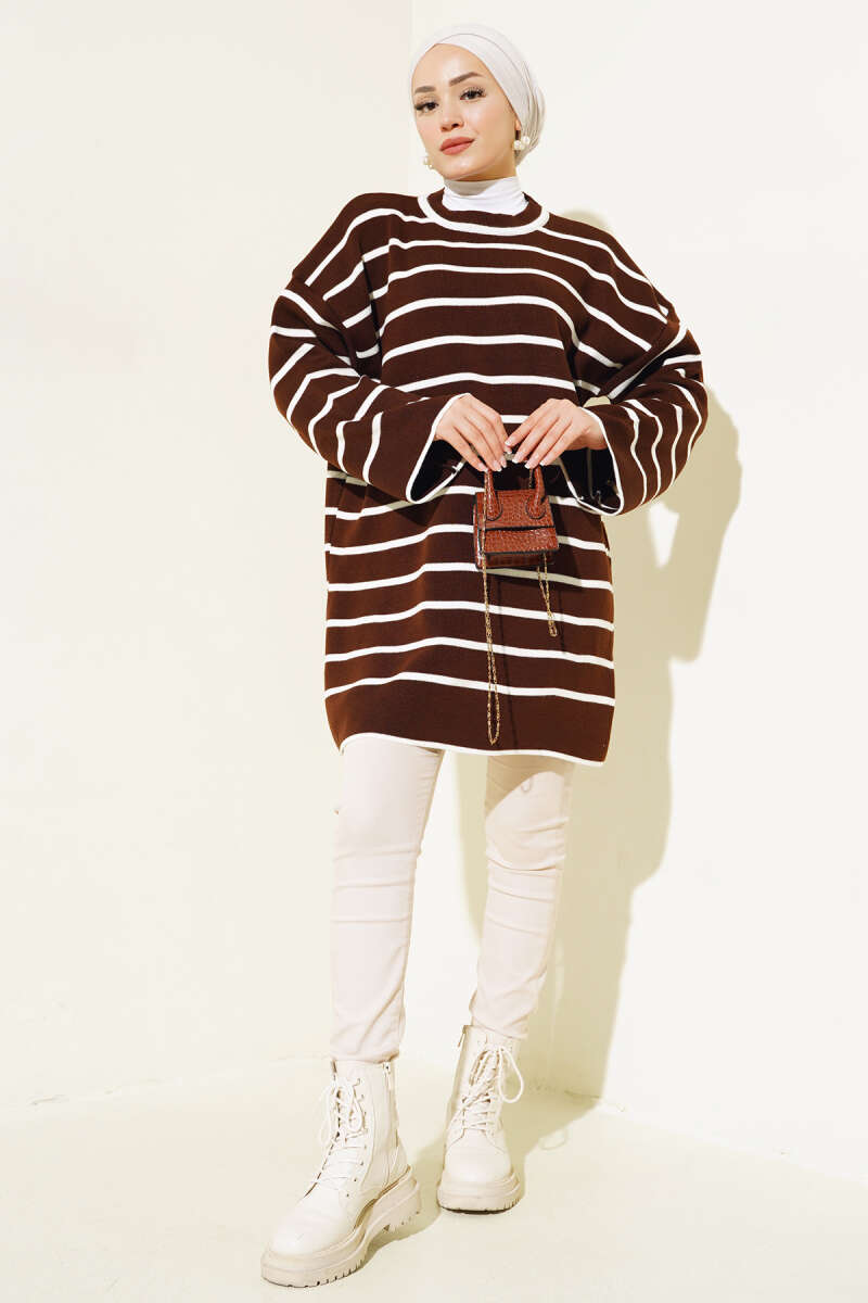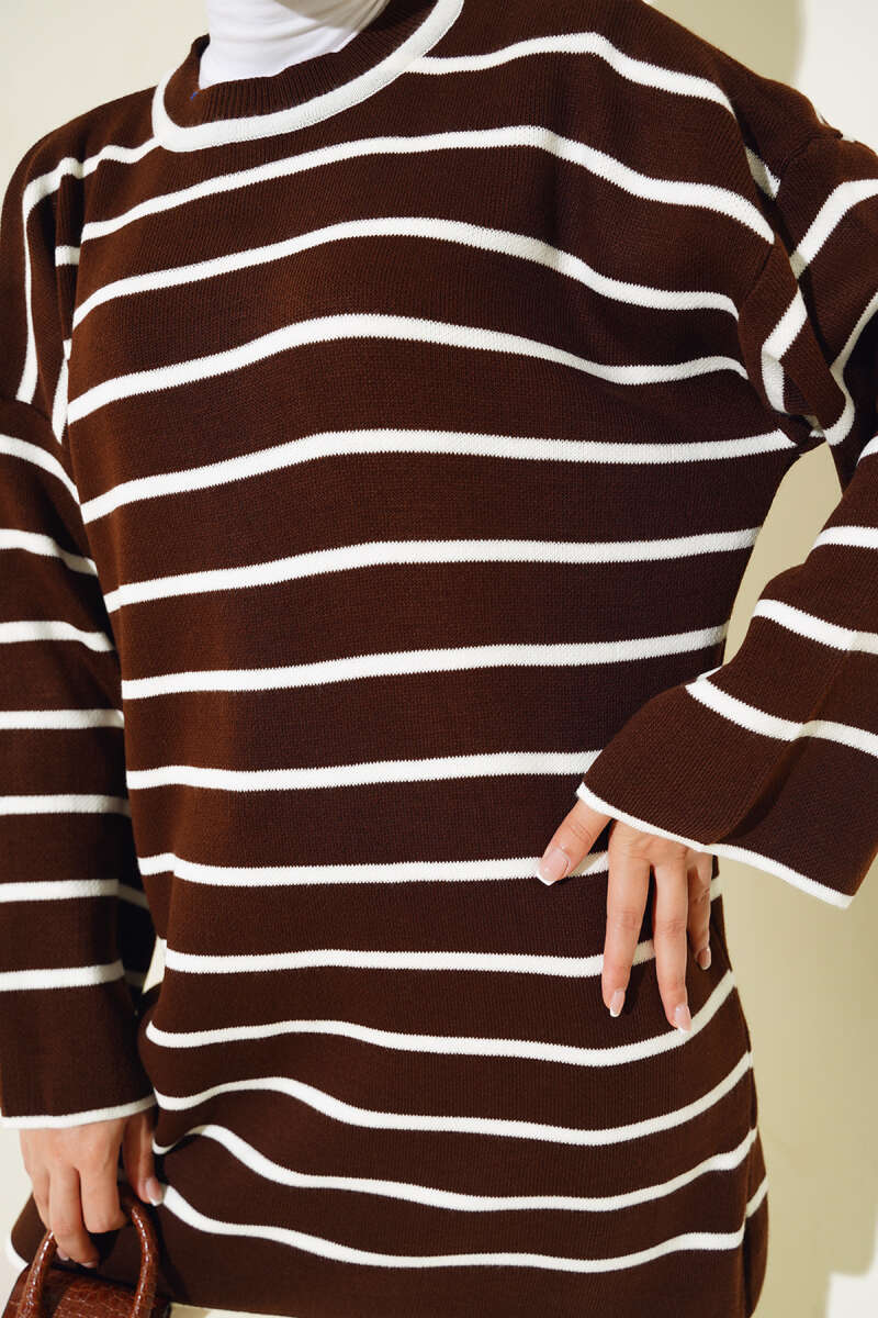 Yatay Çizgili Düşük Omuz Triko Tunik Kahve