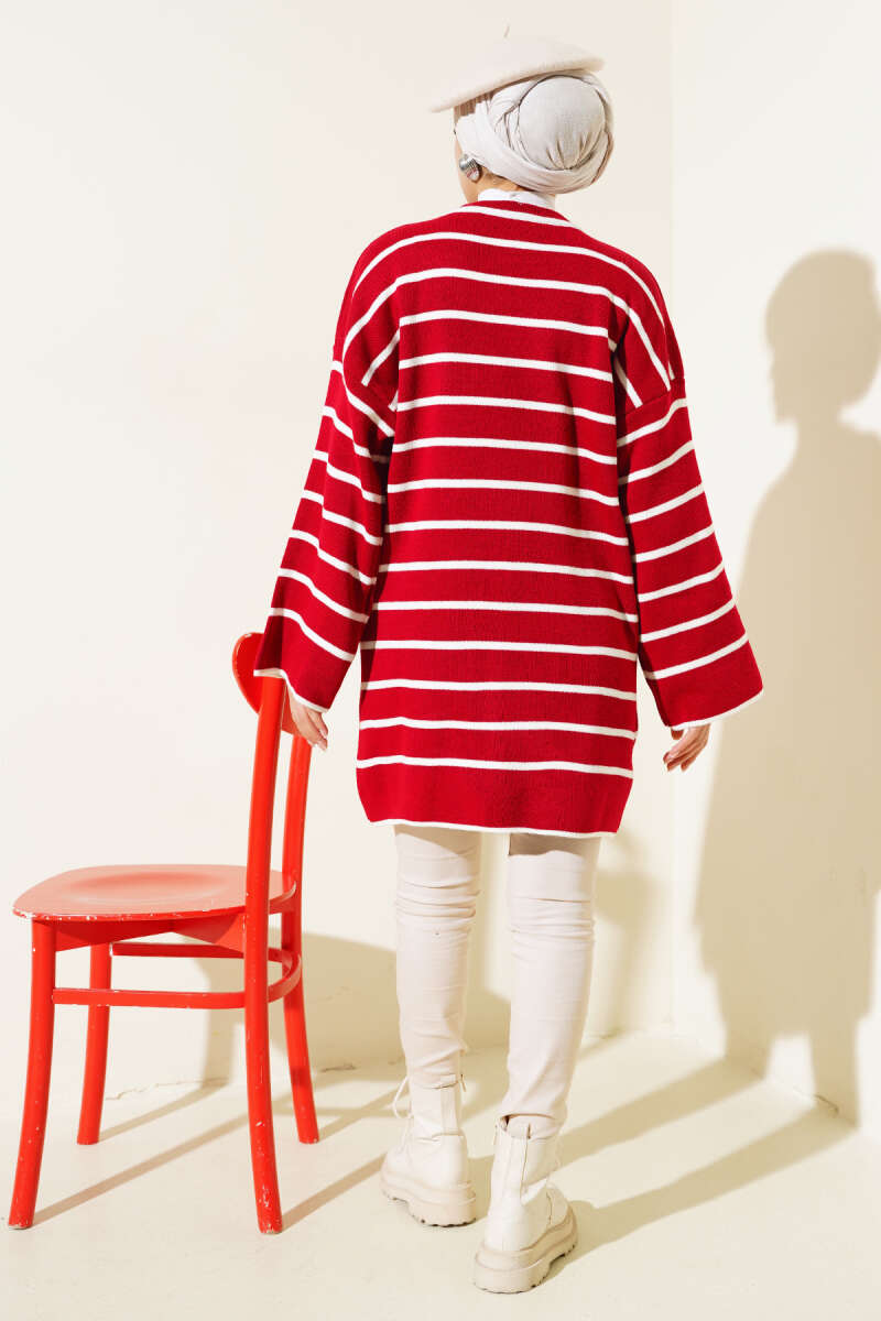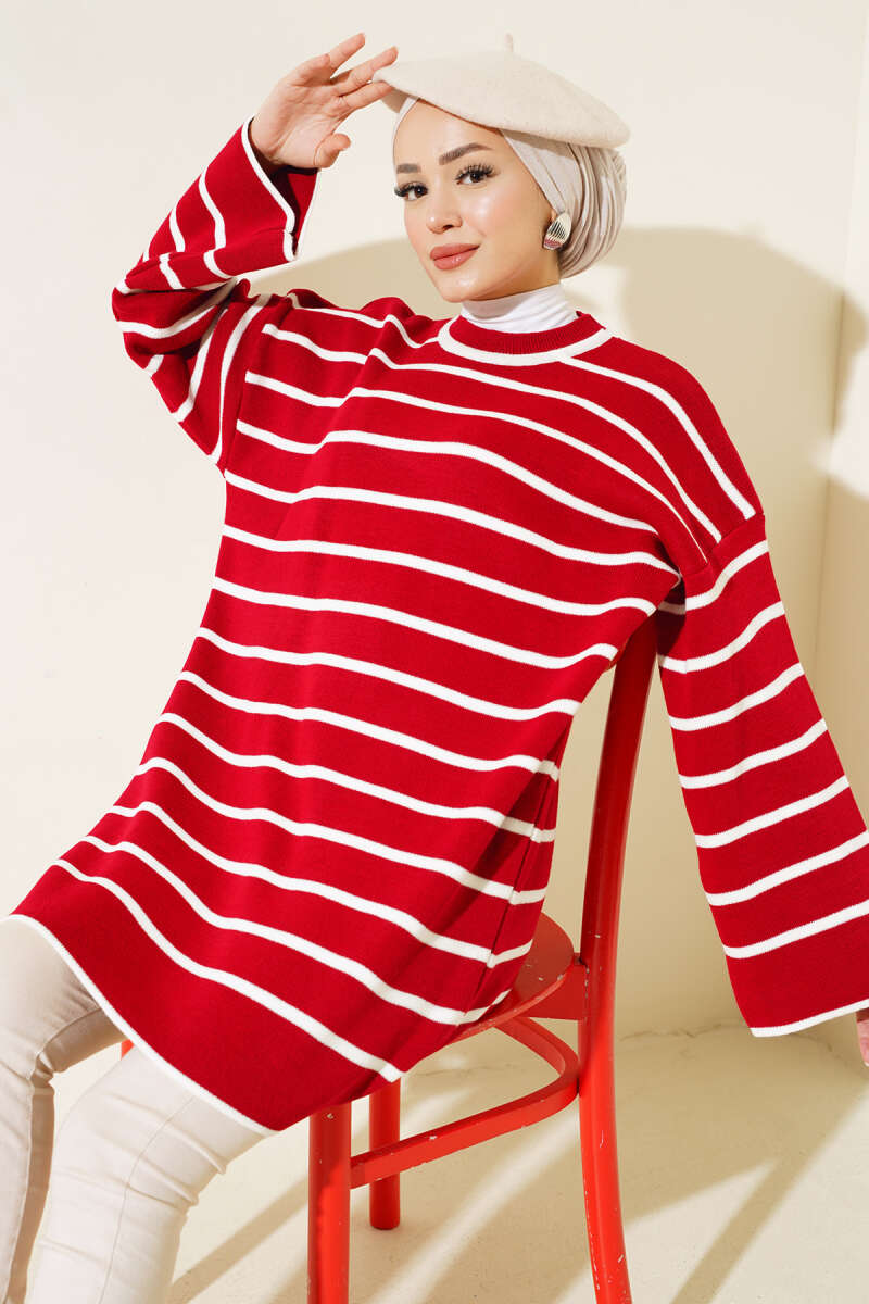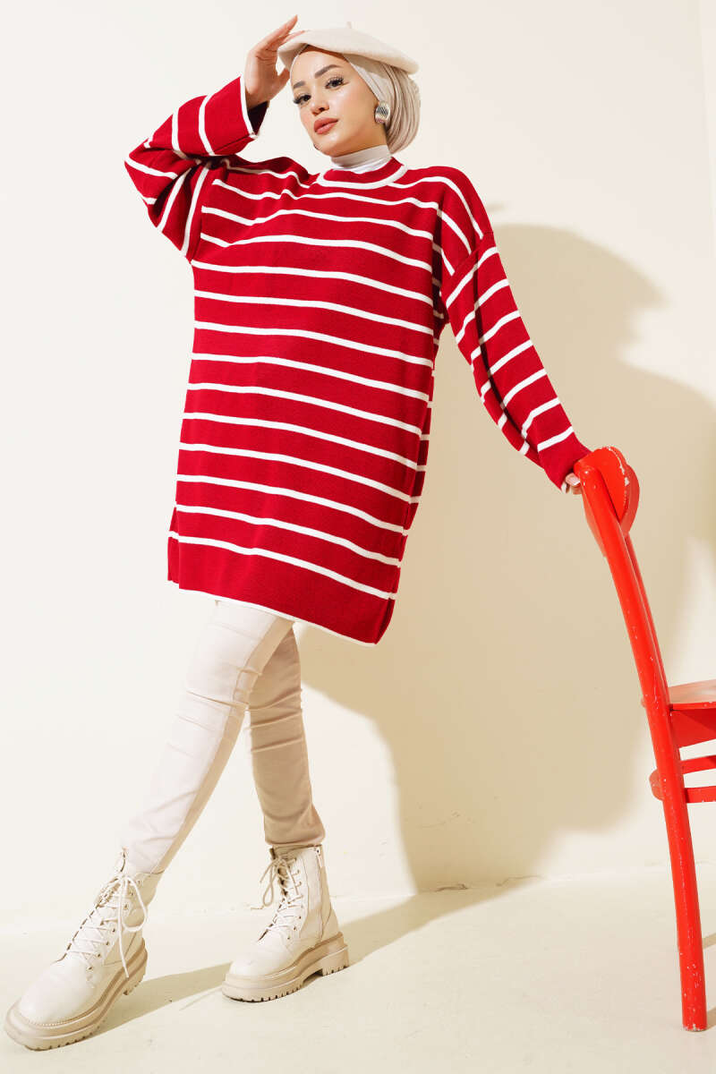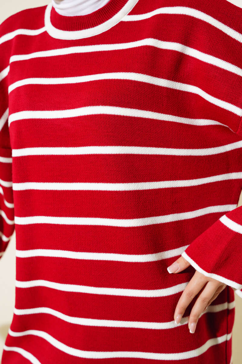 Yatay Çizgili Düşük Omuz Triko Tunik Bordo