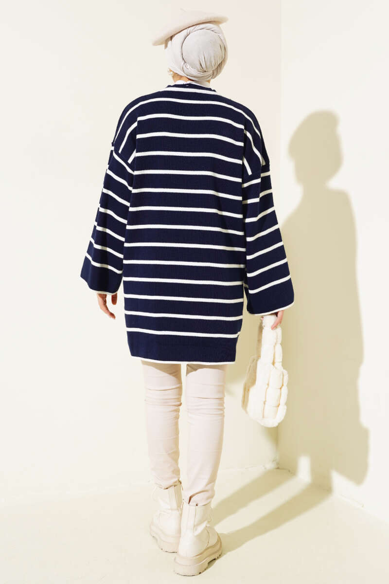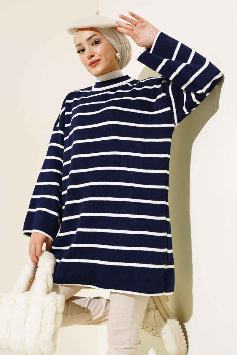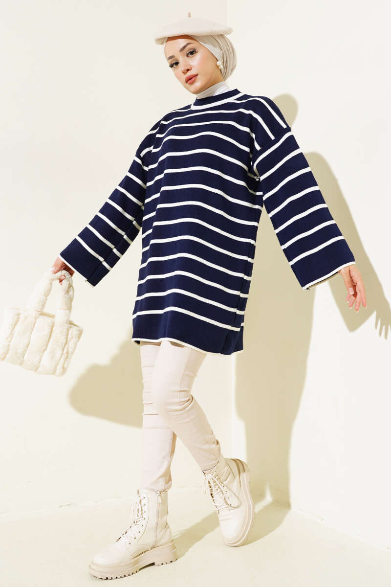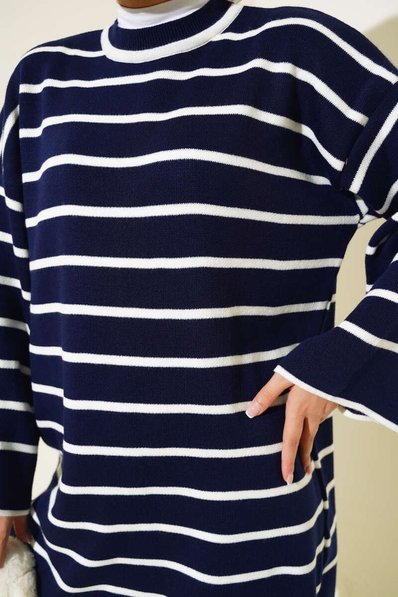 Yatay Çizgili Düşük Omuz Triko Tunik Lacivert
