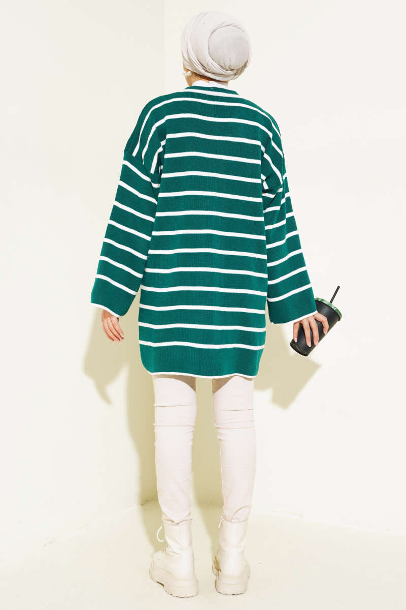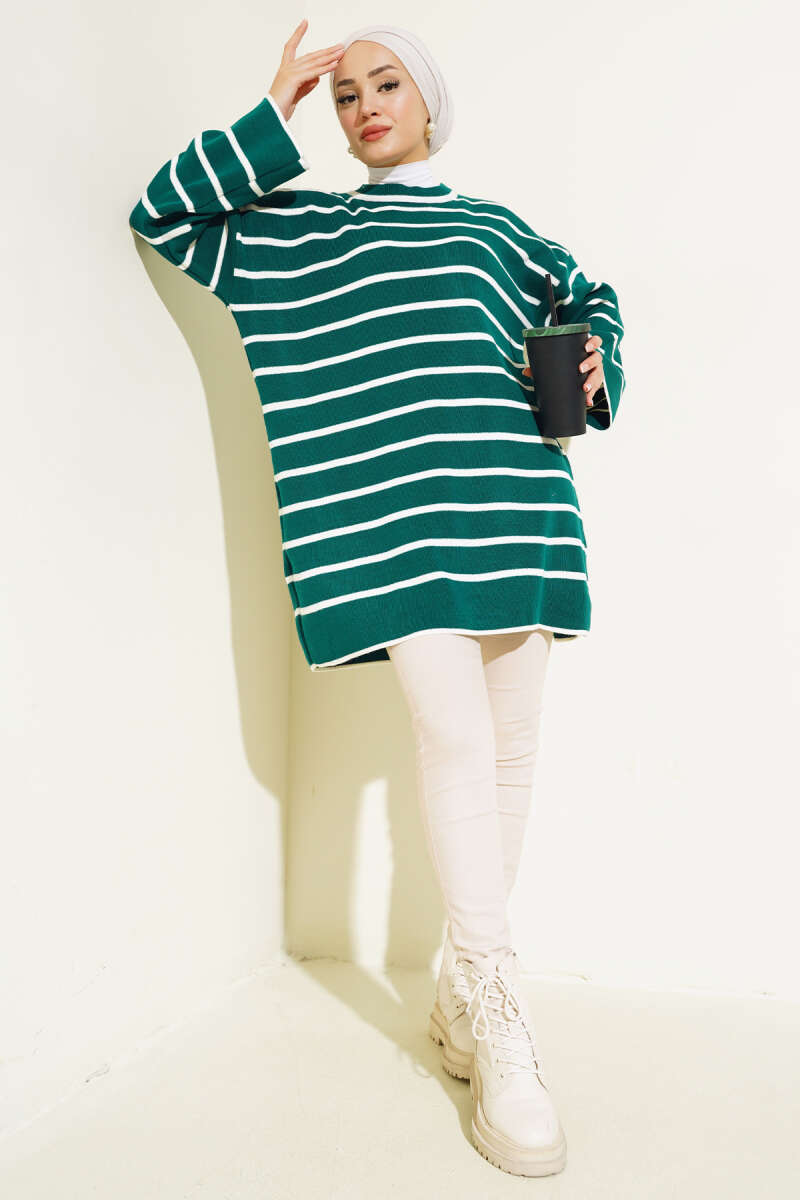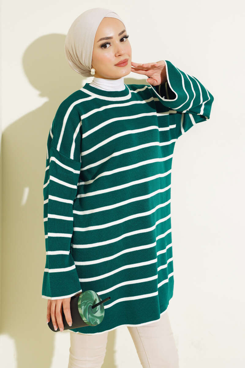 Yatay Çizgili Düşük Omuz Triko Tunik Kahve
