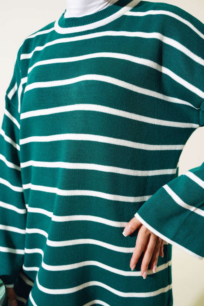 Yatay Çizgili Düşük Omuz Triko Tunik Lacivert
