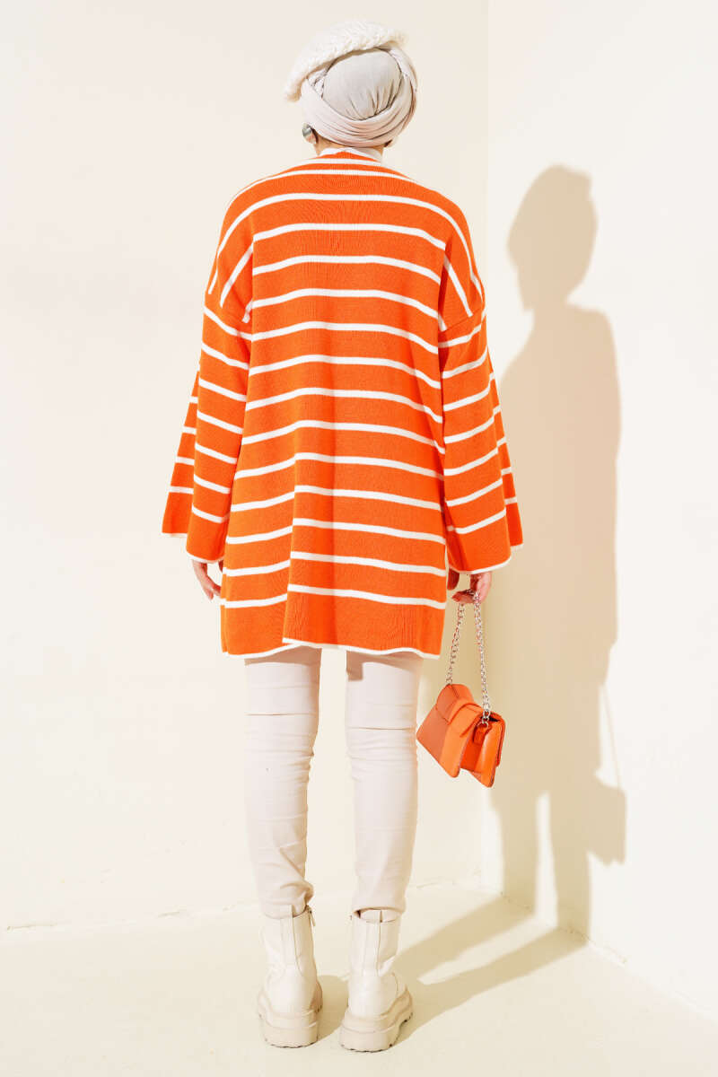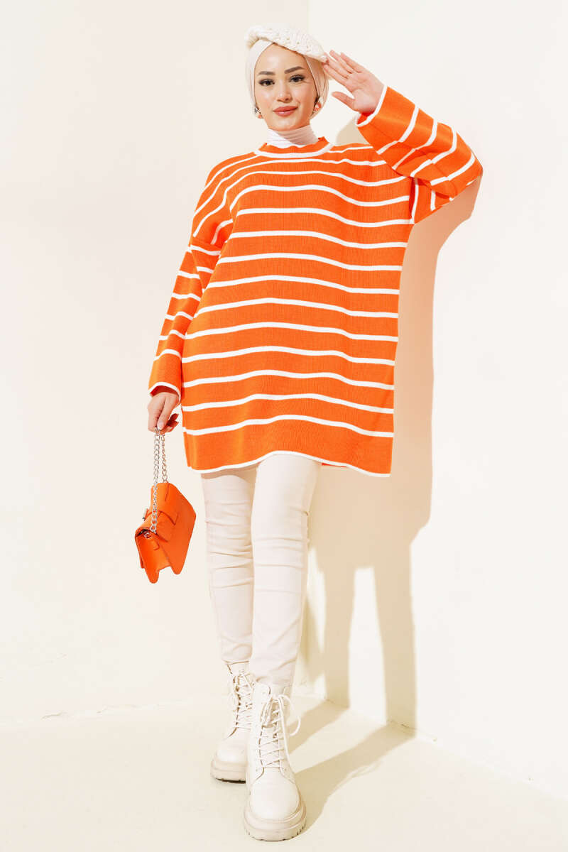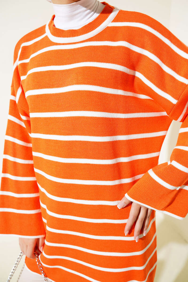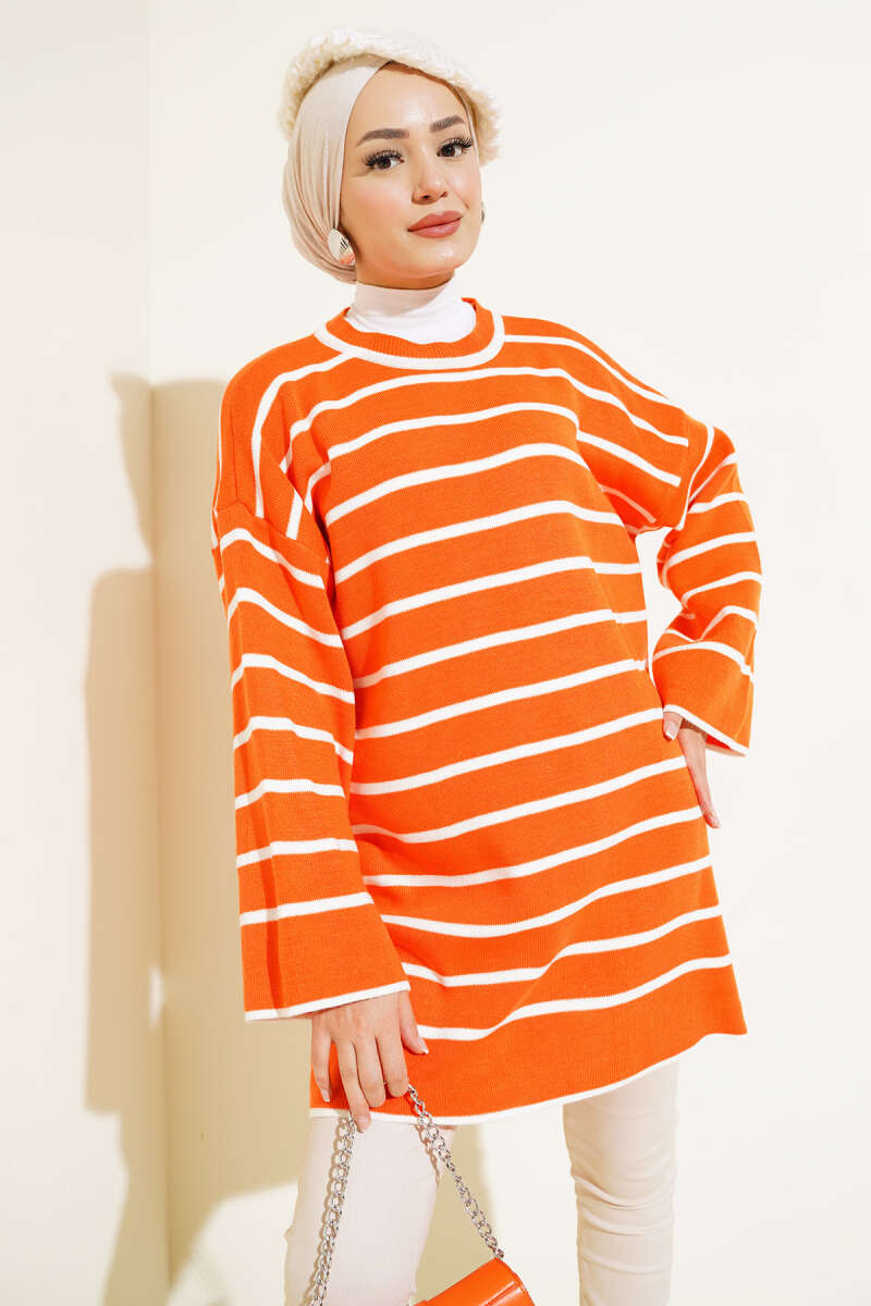 Yatay Çizgili Düşük Omuz Triko Tunik Kahve