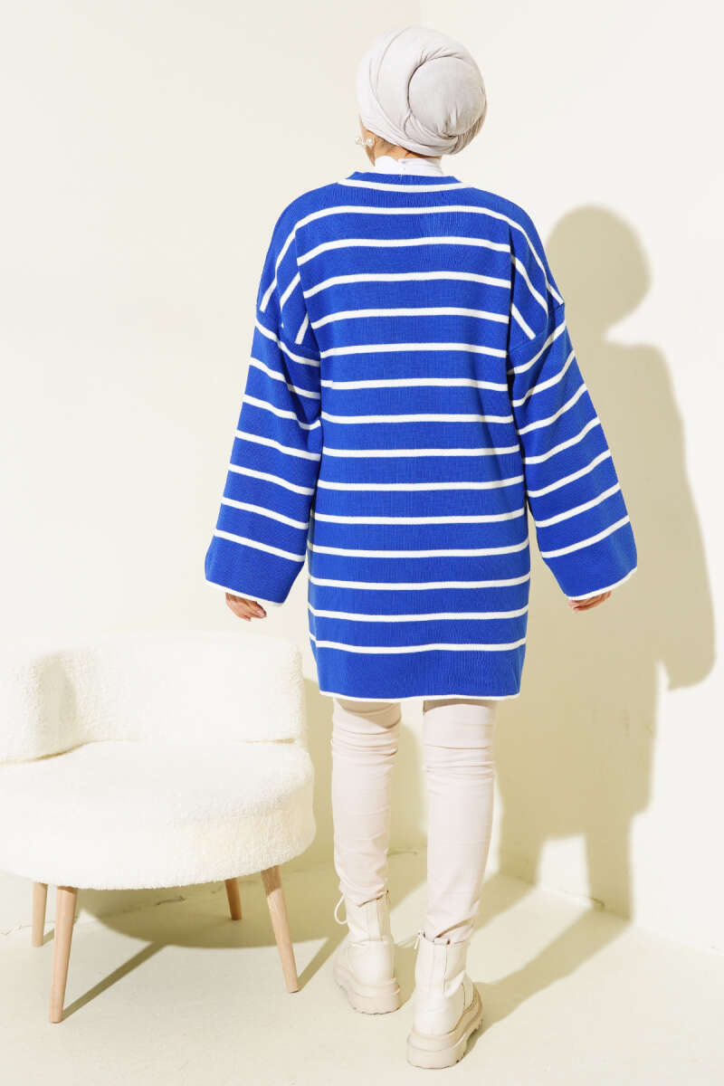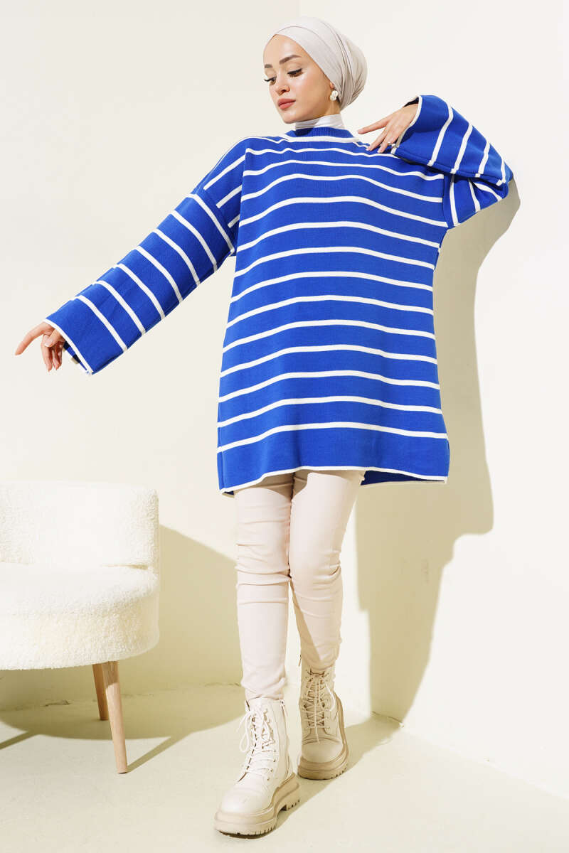 Yatay Çizgili Düşük Omuz Triko Tunik Mavi