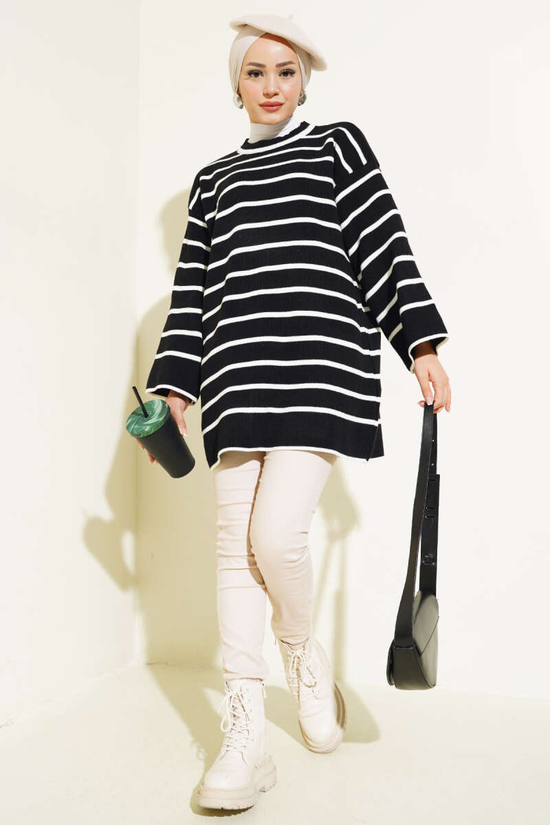 Çizgili Düşük Omuz Triko Tunik Siyah