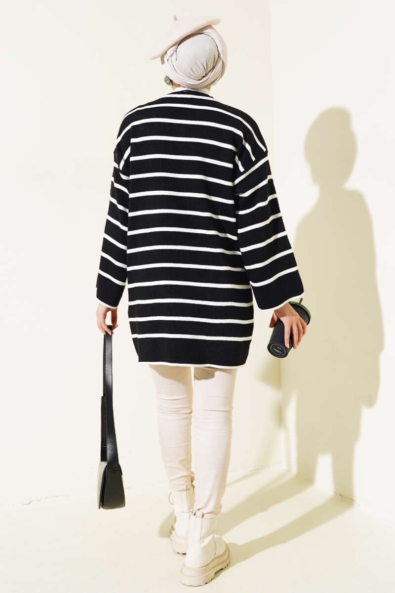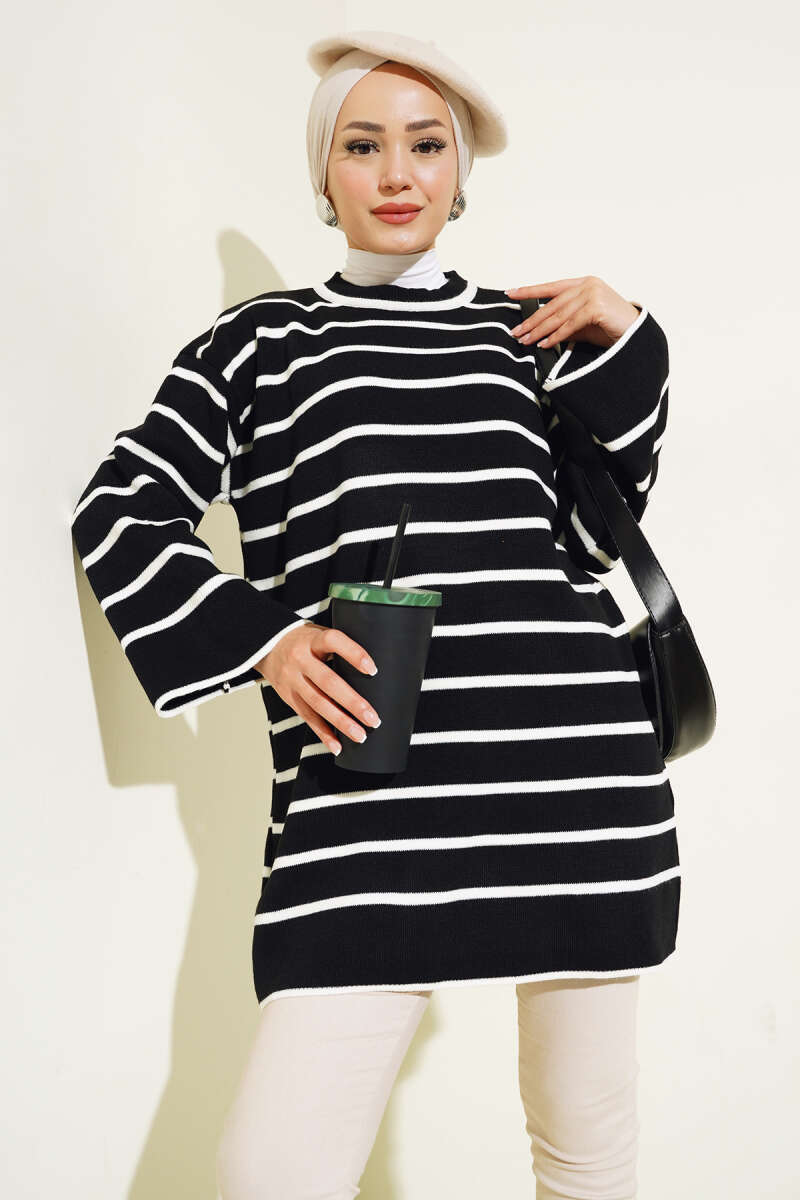 Yatay Çizgi Detaylı Basic Triko Tunik Siyah