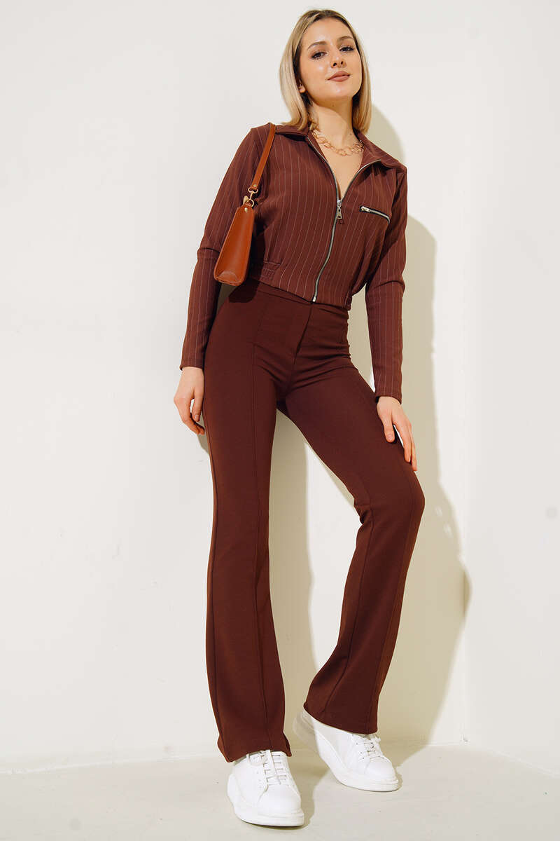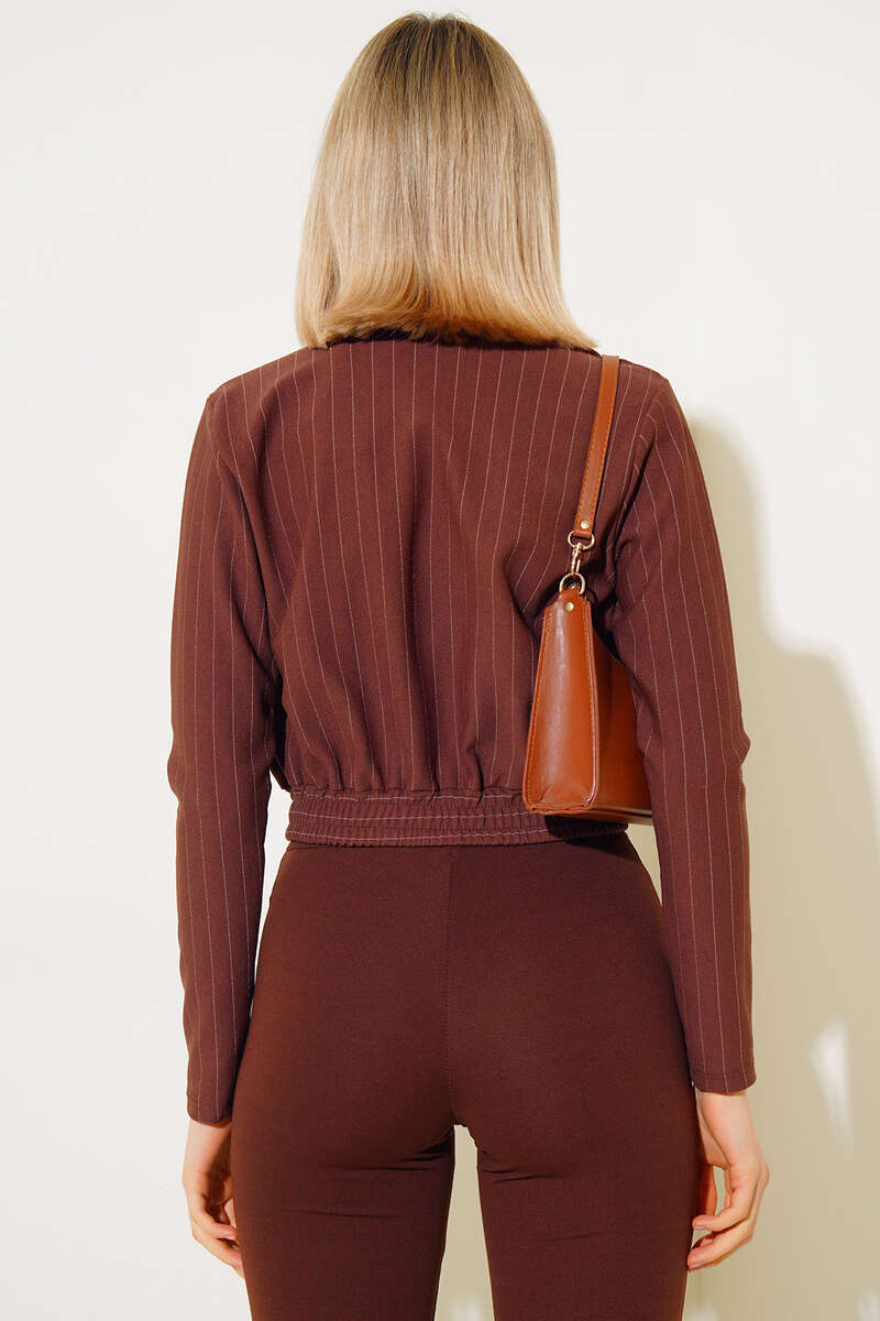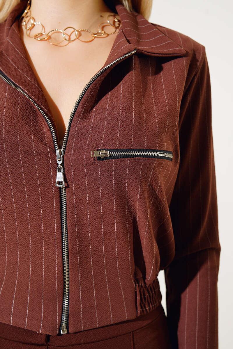 Çizgili Fermuar Detay Kısa Ceket Kahve