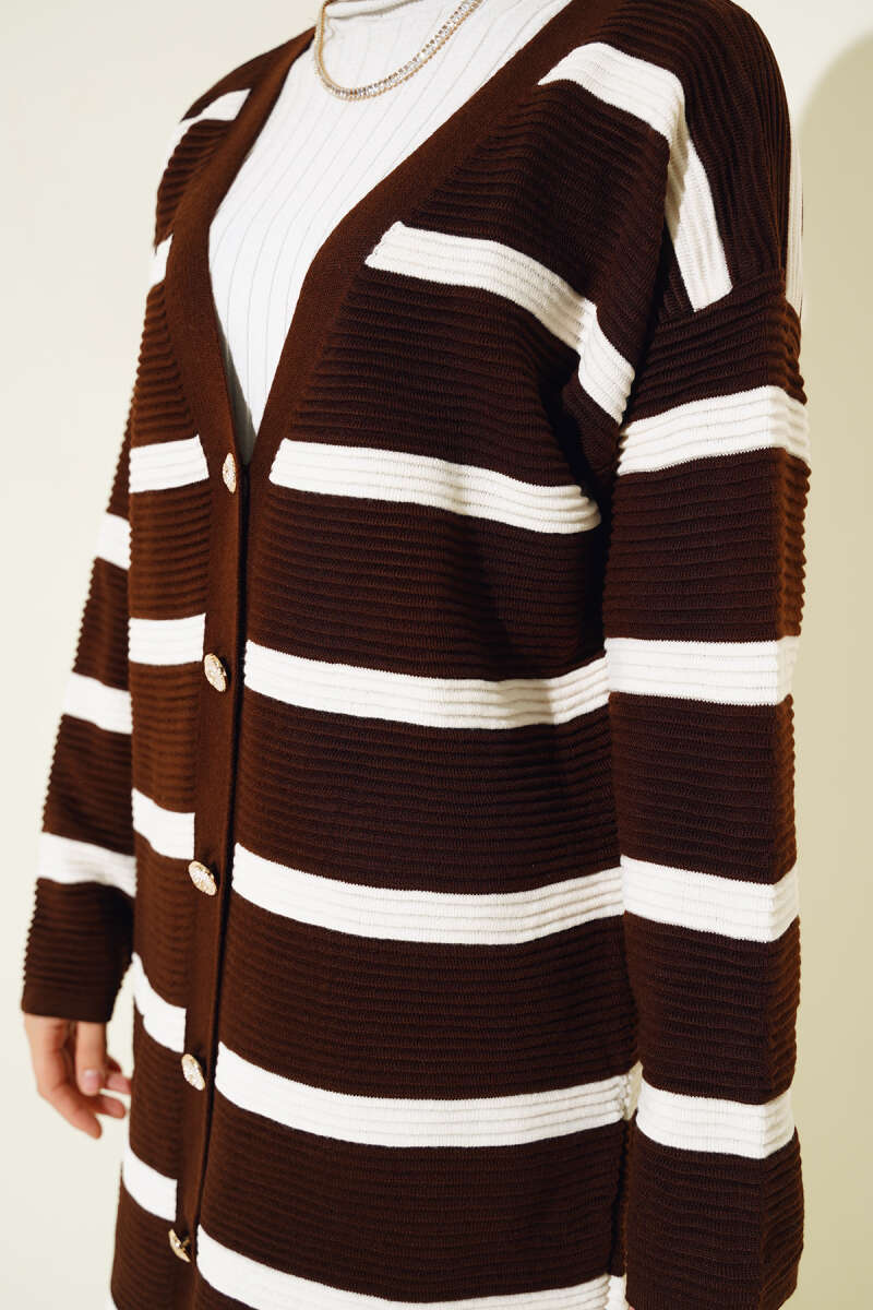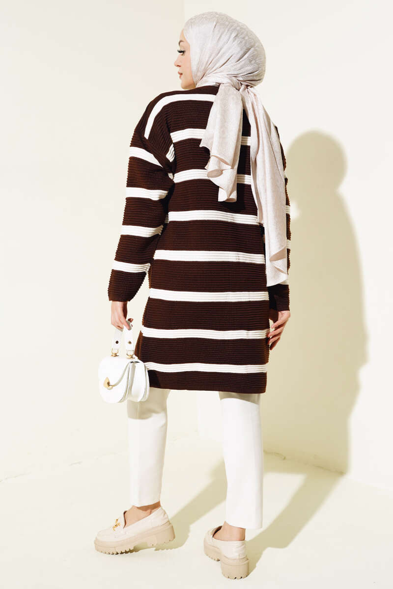 Çizgili Fitilli Salaş Triko Hırka Kahve