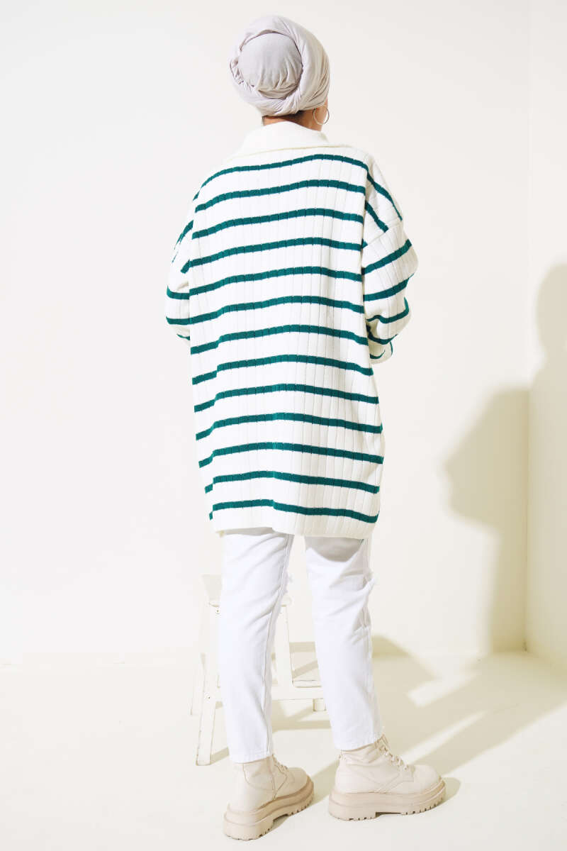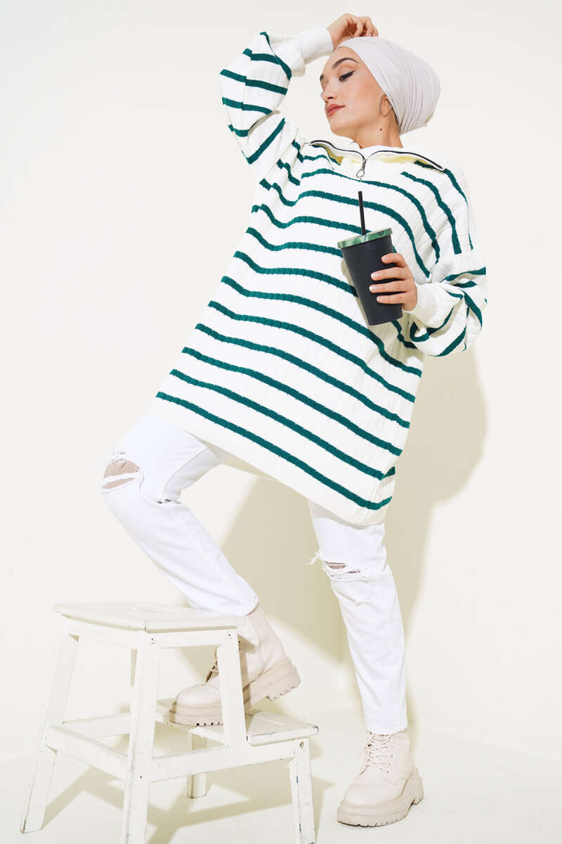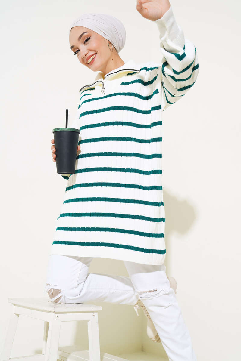 Çizgili Fitilli Yakası Fermuarlı Triko Tunik Siyah