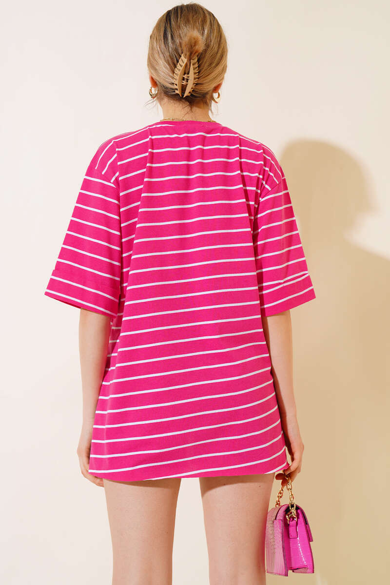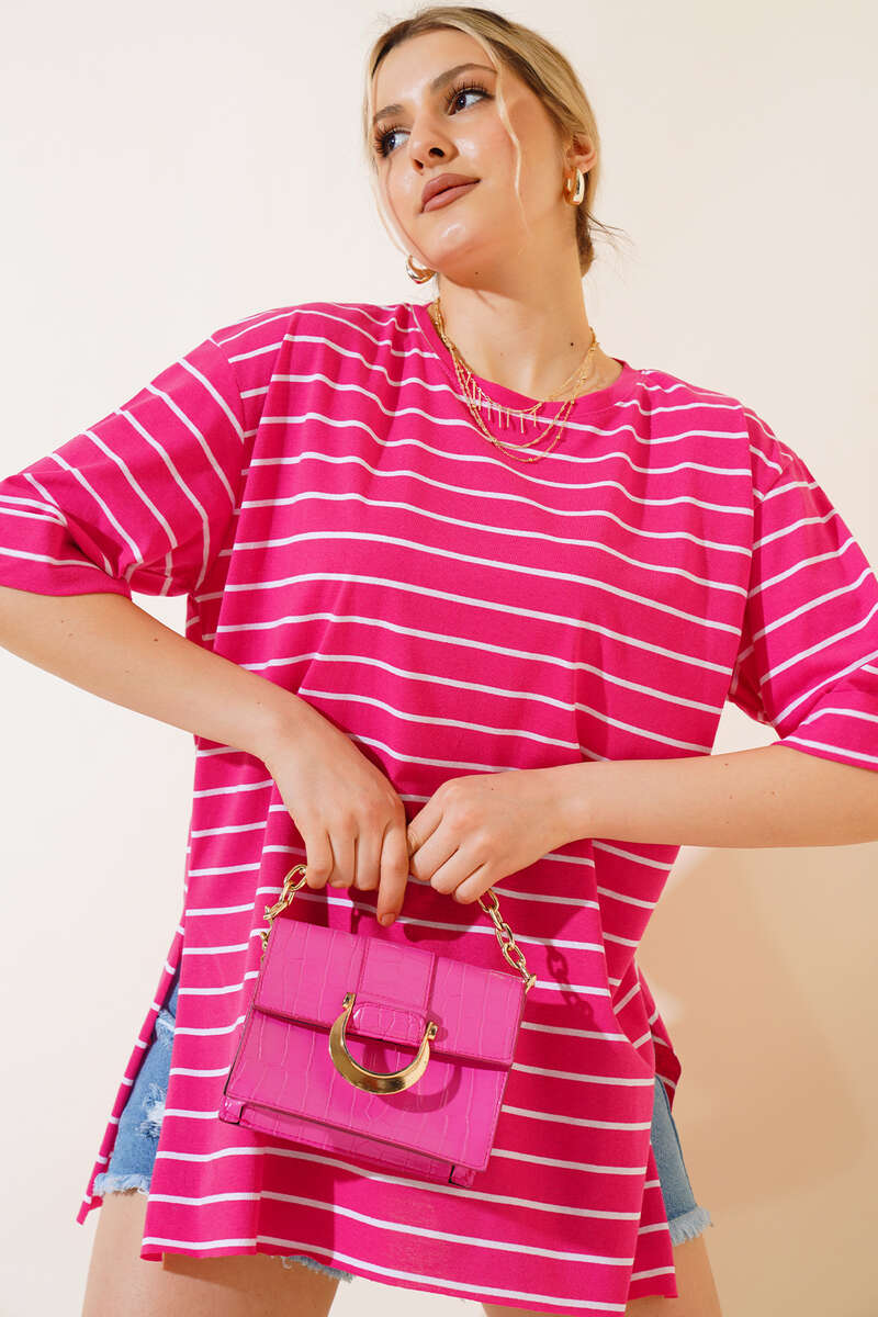 Bu yaz tarzıyla fark yaratan tshirtümüz çizgili desenleriyle dikkat çekmektedir. Oval yaka olan tshirt modelimizin yanları yırtmaçlıdır. Renk seçenekleri mevcuttur.