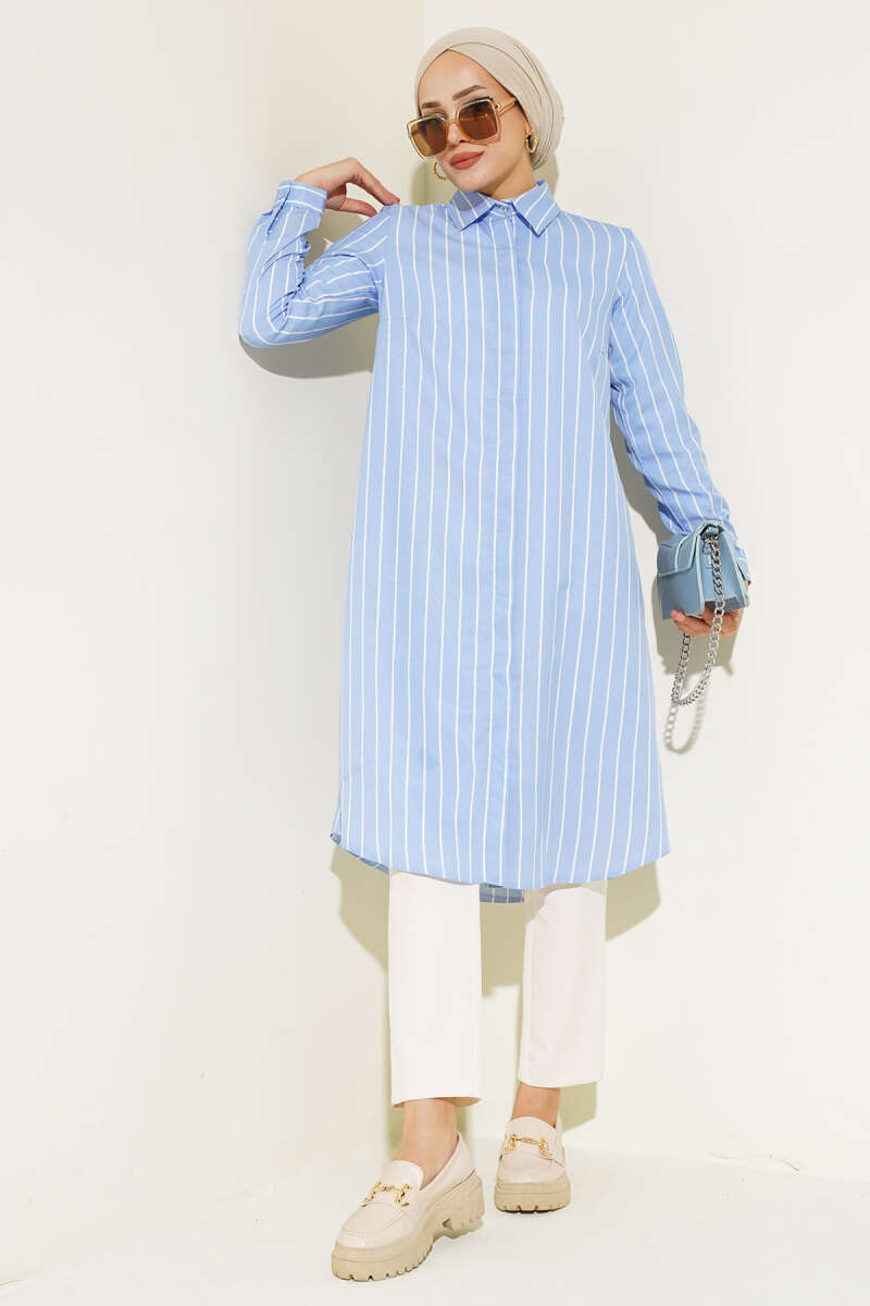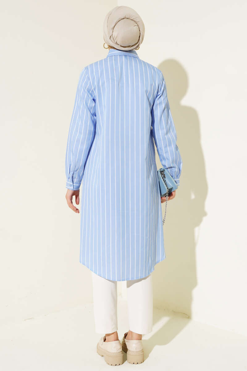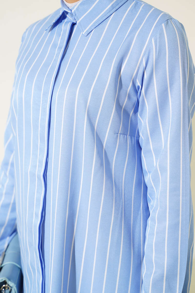 Çizgili Gizli Düğmeli Gömlek Mavi