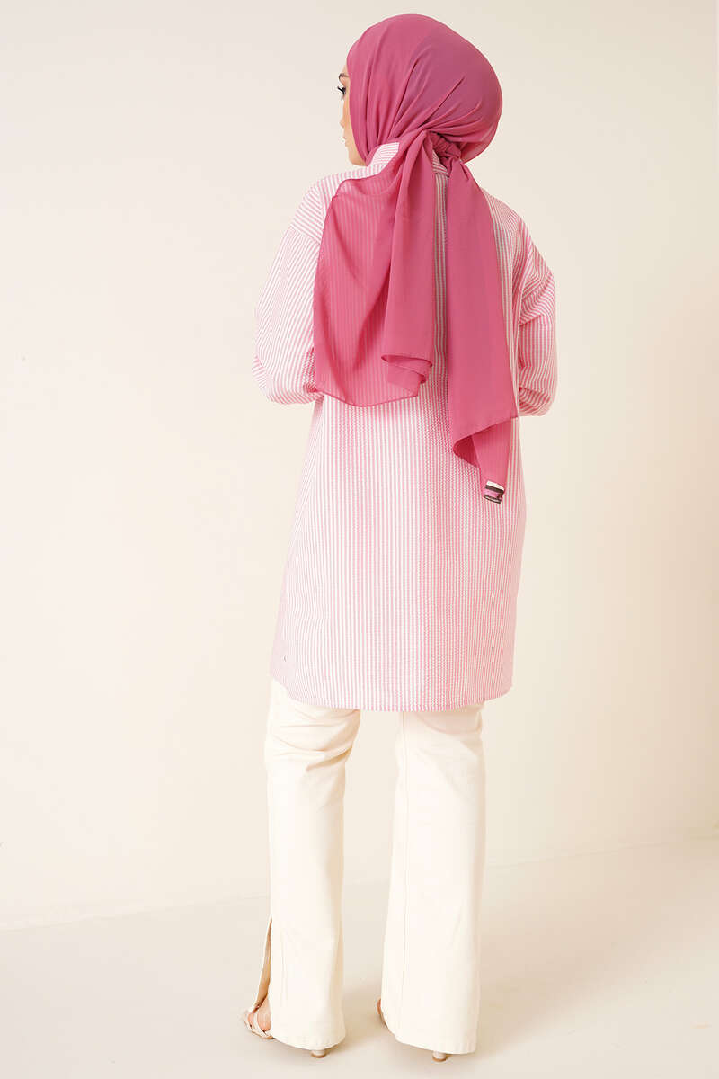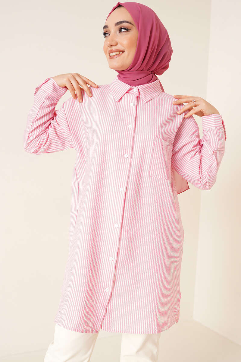 Çizgili Gofre Kumaş Pembe Gömlek