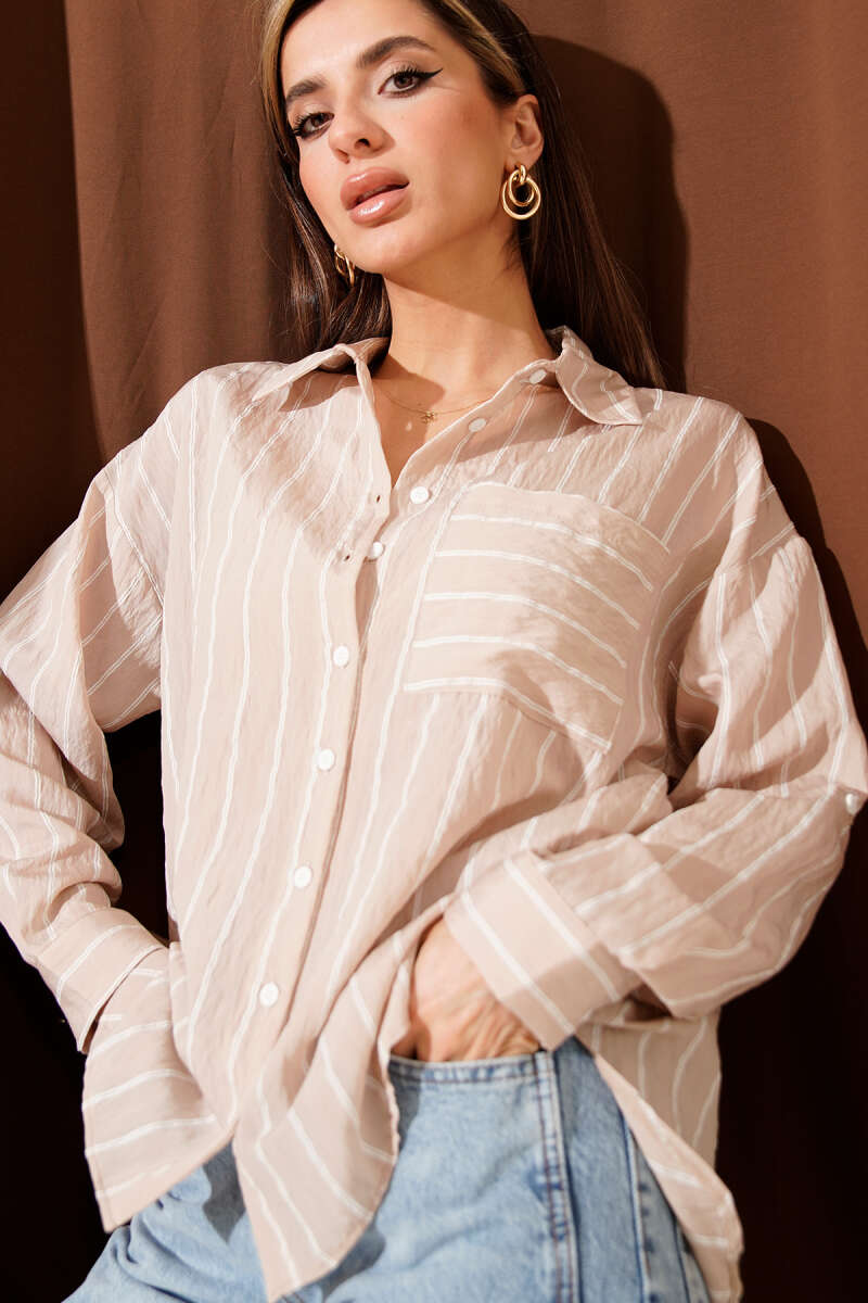 Çizgili Göğüs Cepli Salaş Gömlek Bej