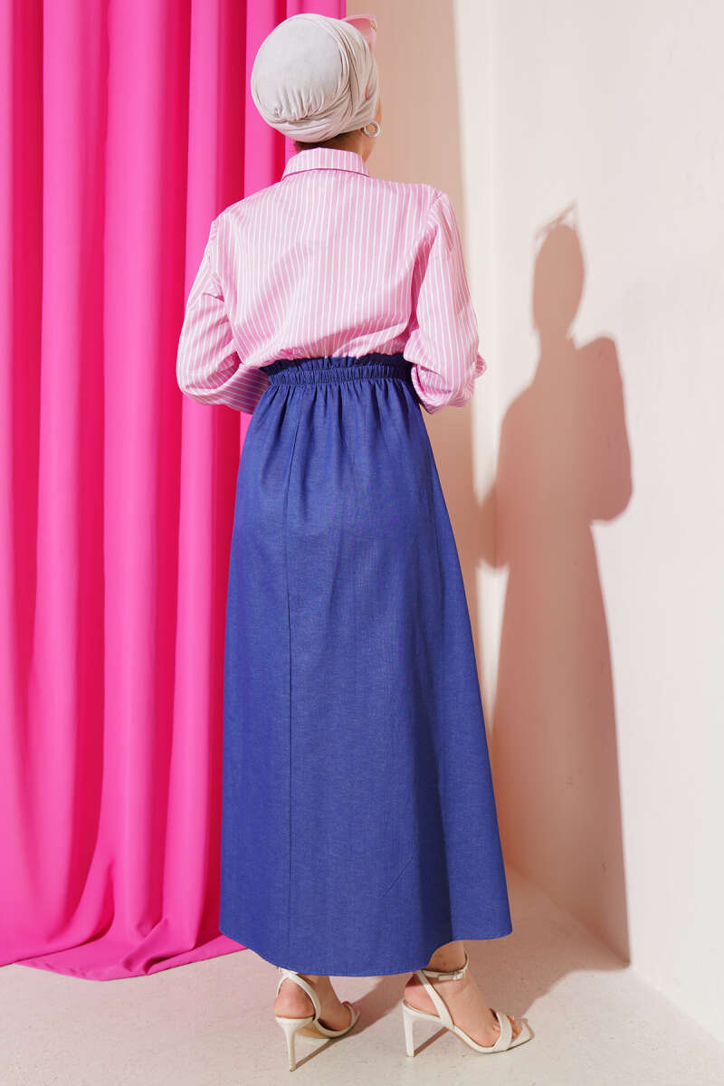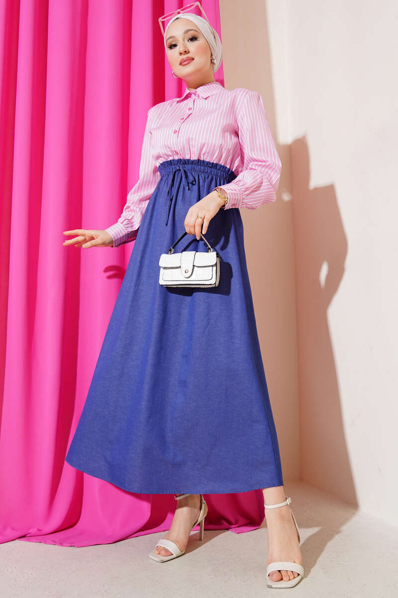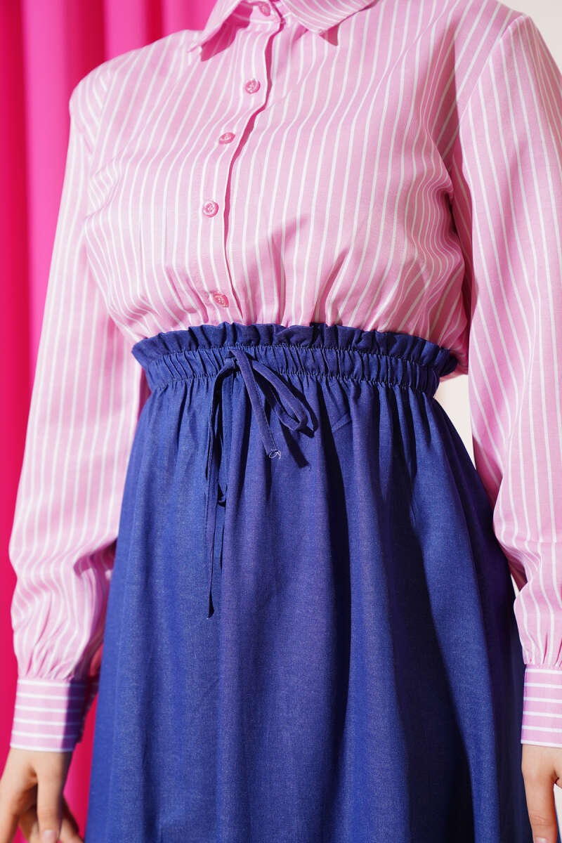 Çizgili Gömlek Garnili Elbise Pembe