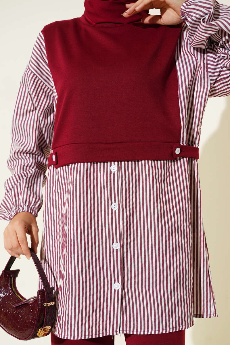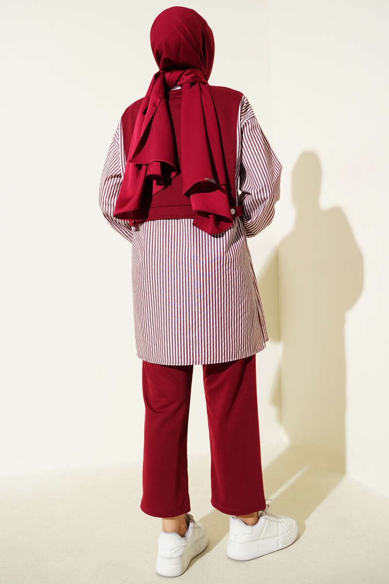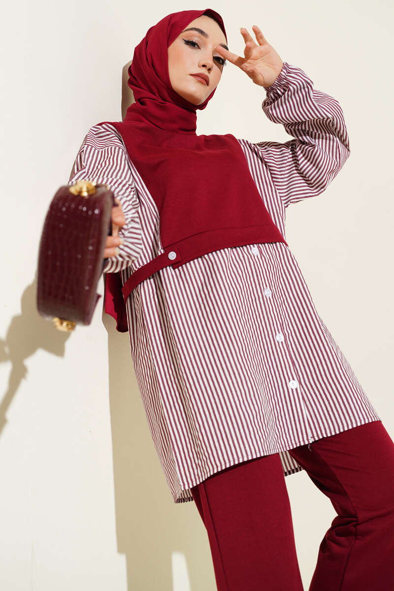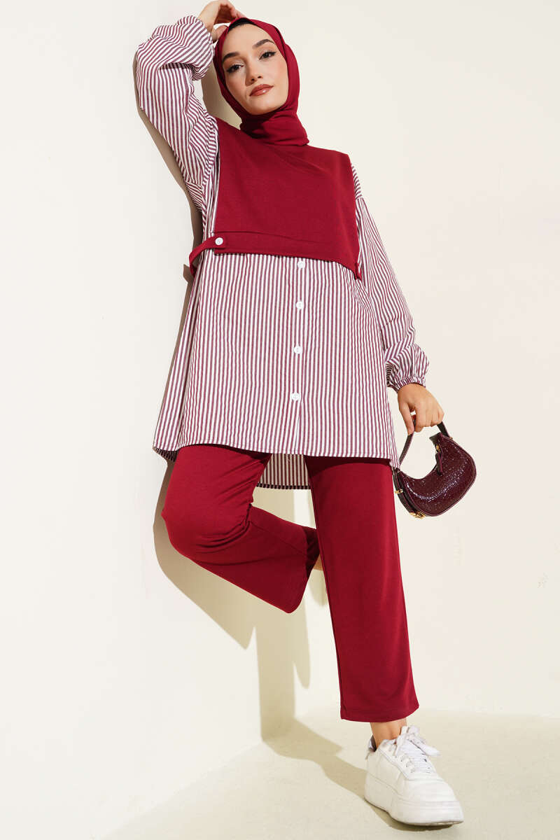Çizgili Gömlek Garnili İkili Takım Bordo