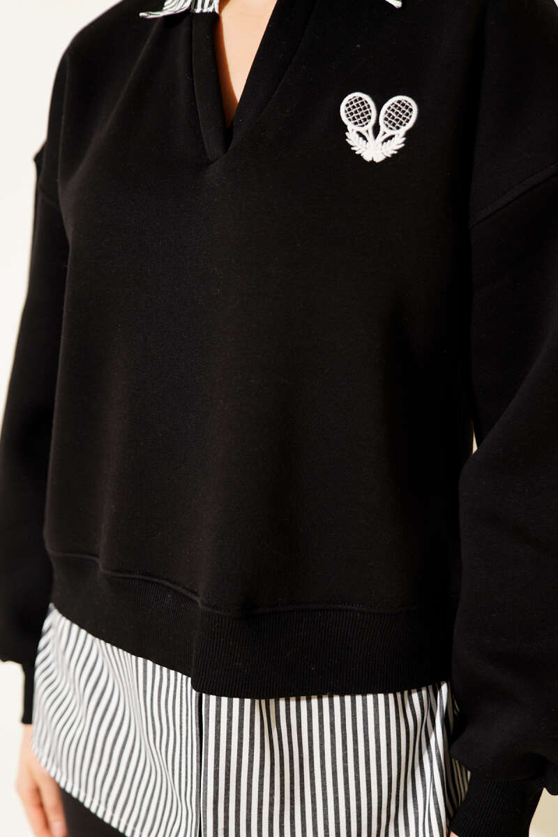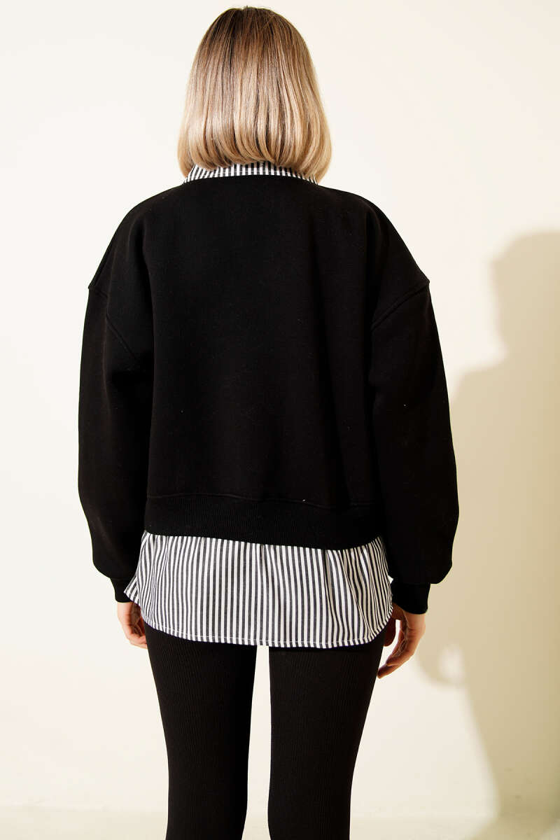 Kol Şeritli Fiyonklu Üç İplik Sweatshirt Siyah