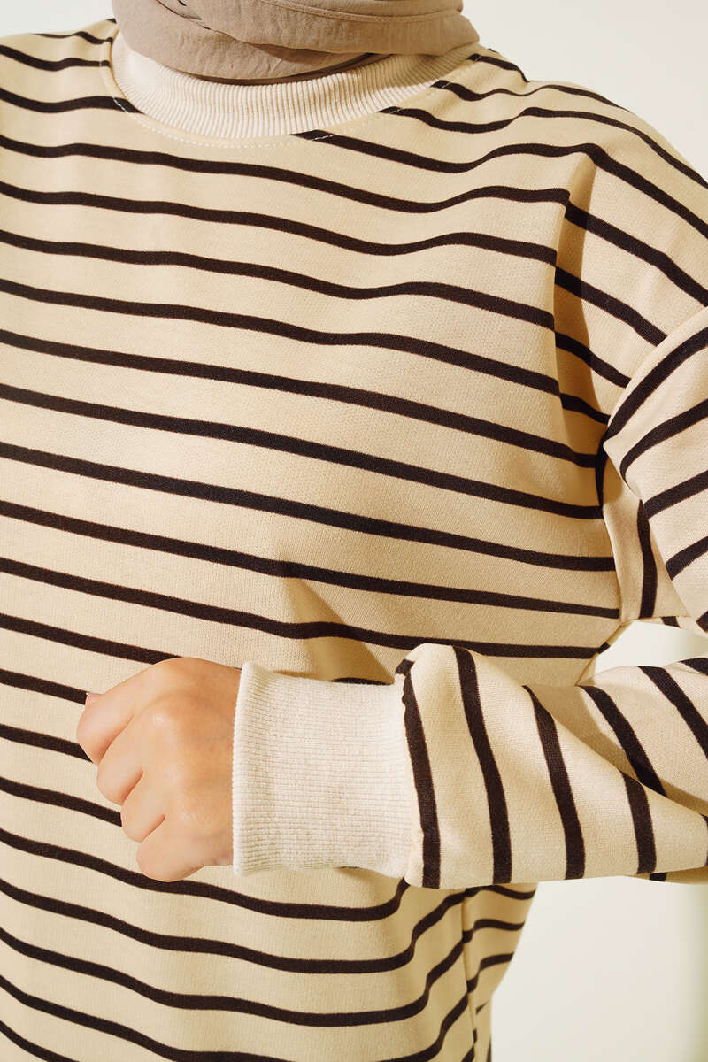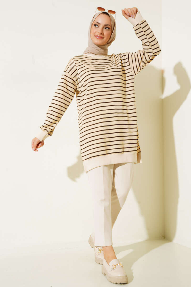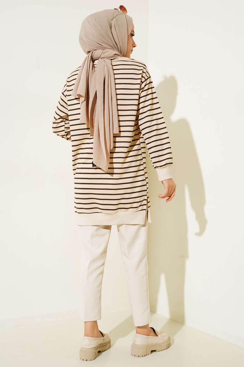 Yeni sezon yatay çizgili tuniğimizin etek uçlarında iki adet yırtmacıyla düşük omuz modeldir. Bilekleri ribanalıdır. Bisiklet yaka olan tuniğimizin yakası da ribanalıdır. Farklı renk seçenekleri mevcuttur.