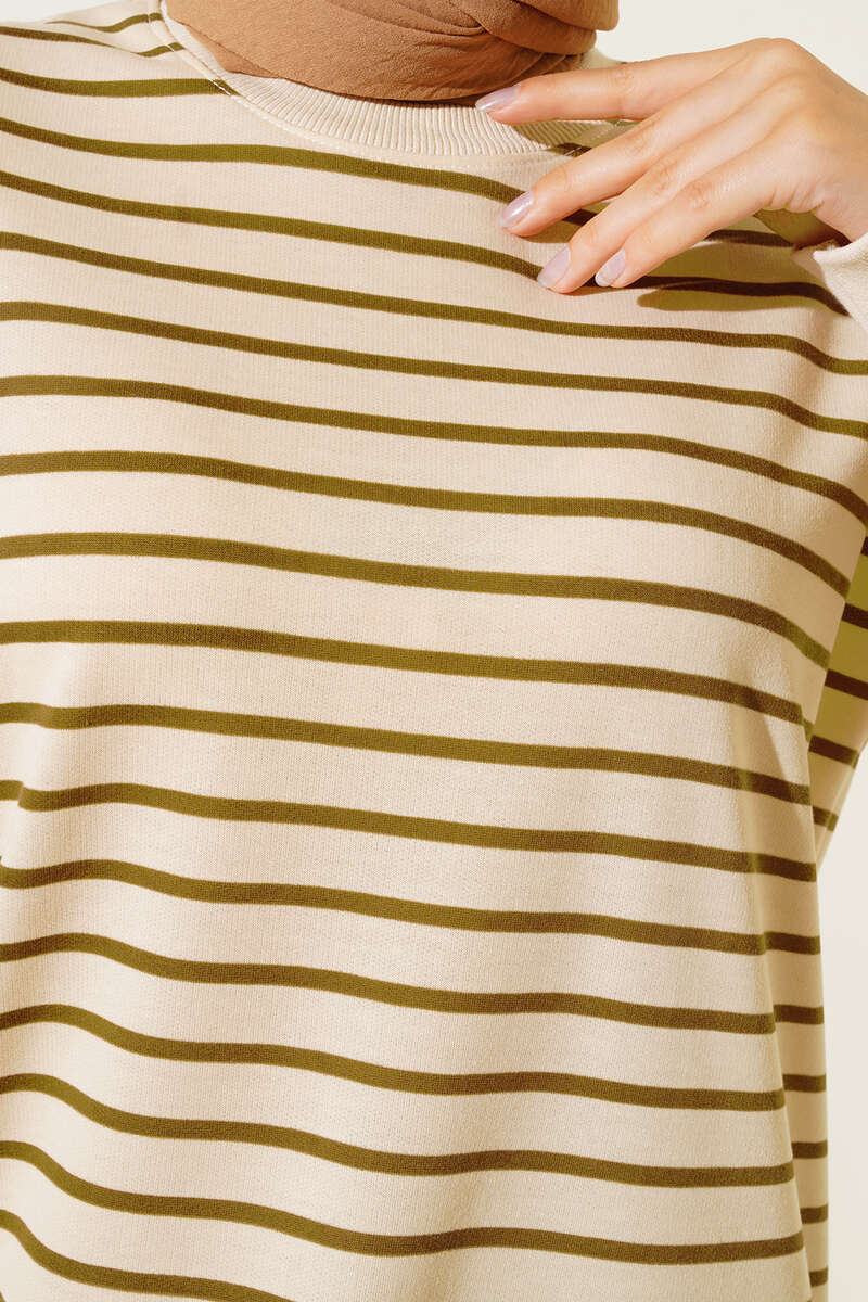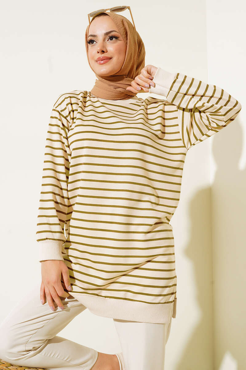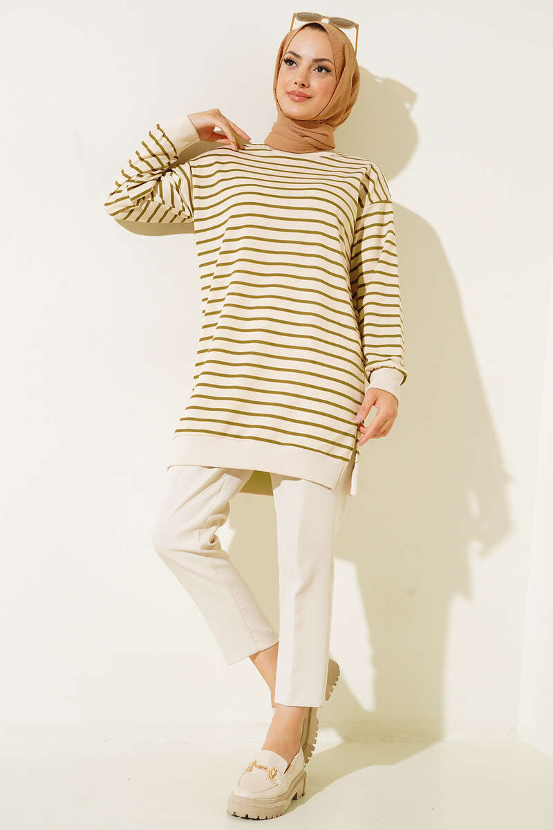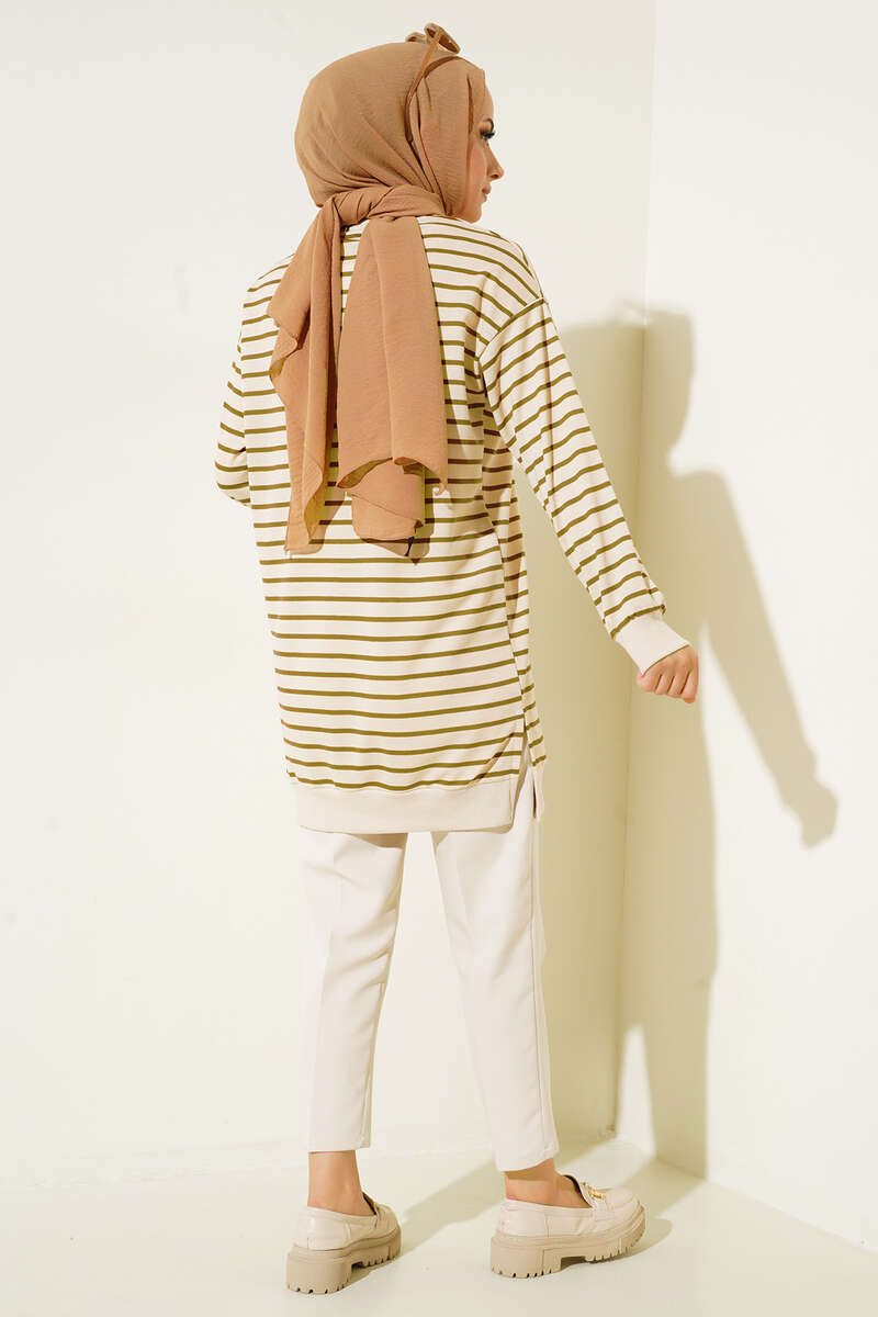 Çizgili Kaşkorse Yırtmaçlı Tunik Yağ Yeşili