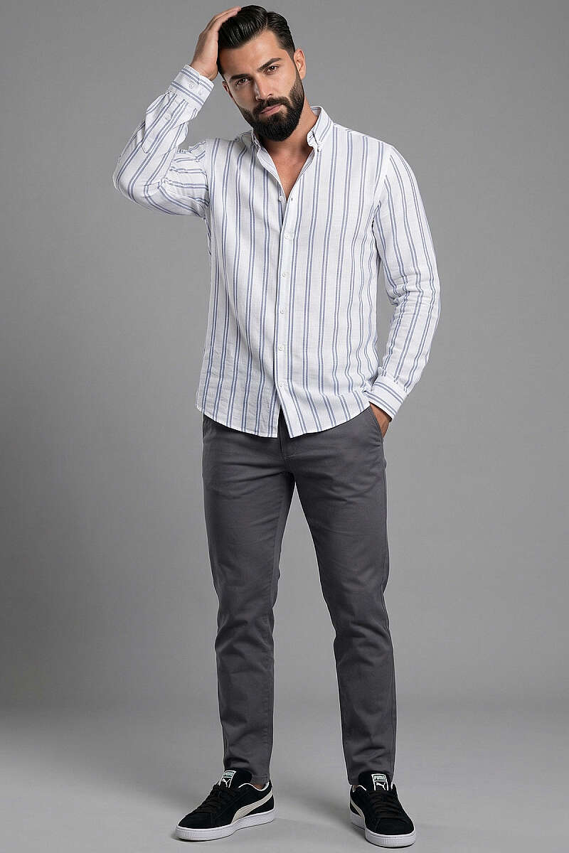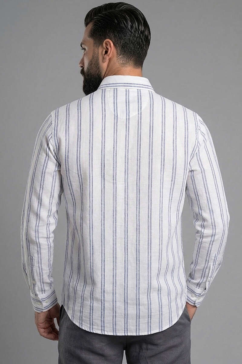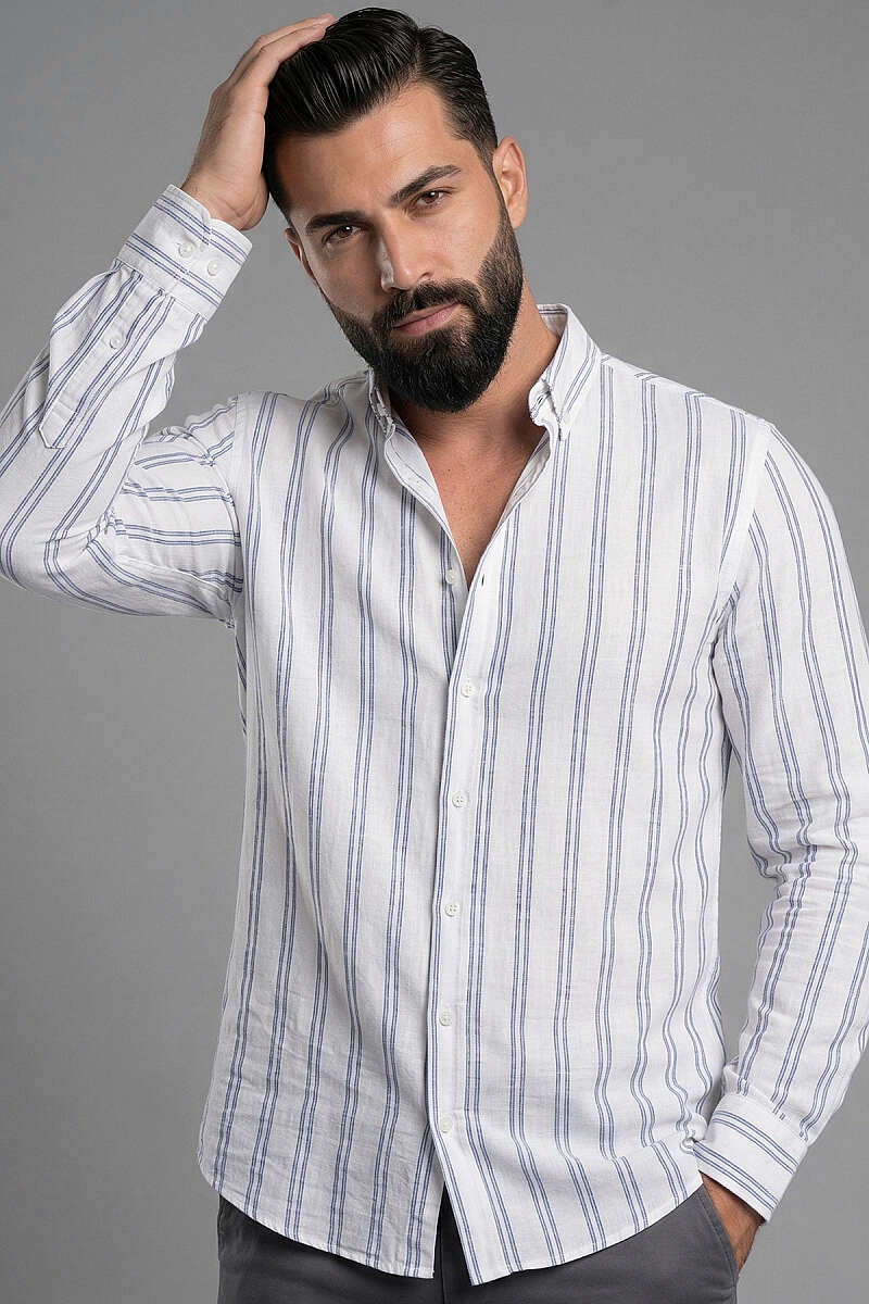 Çizgili Keten Erkek Gömlek Lacivert