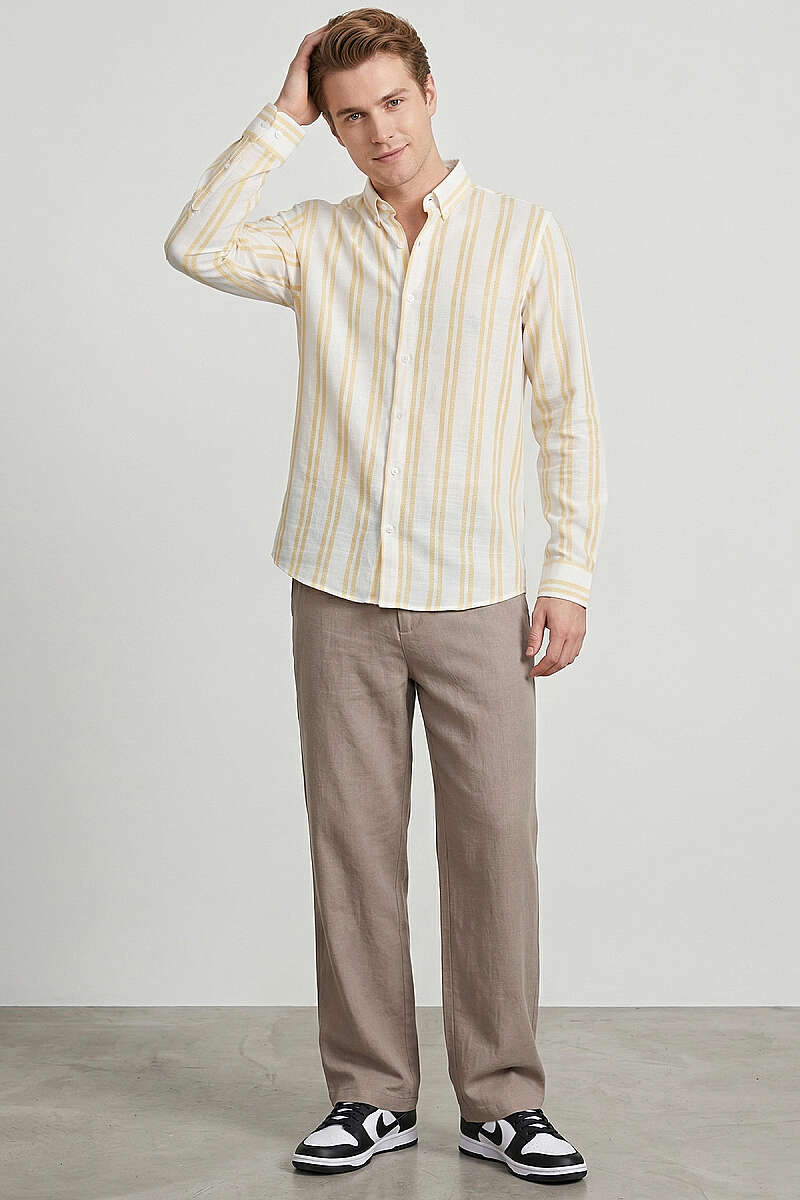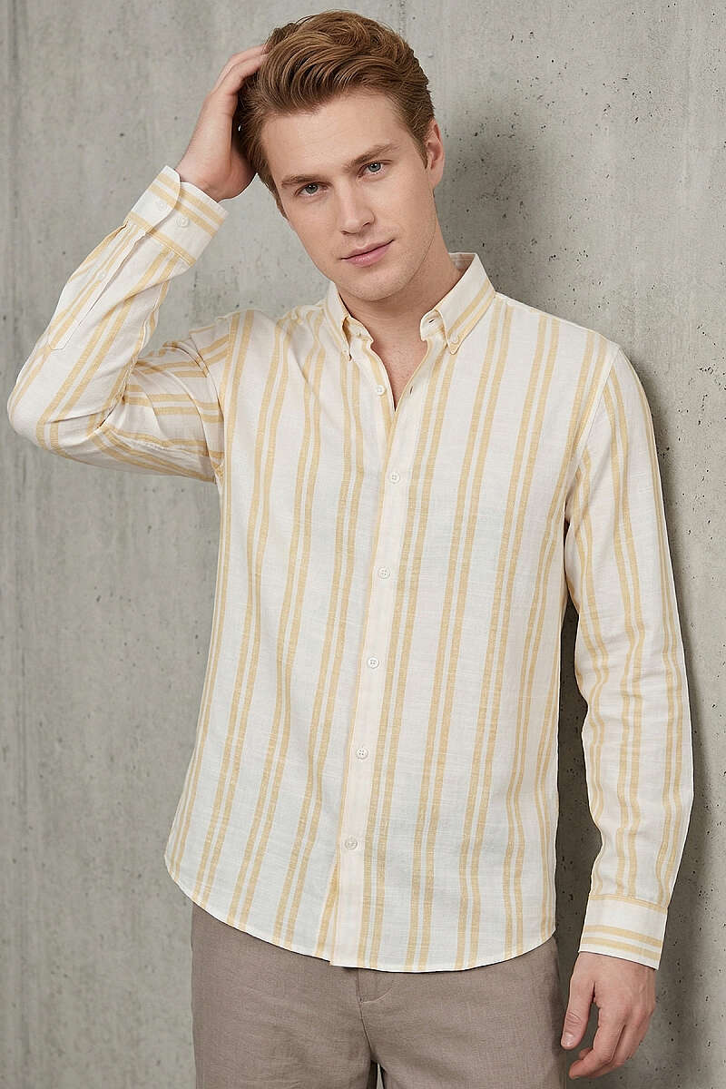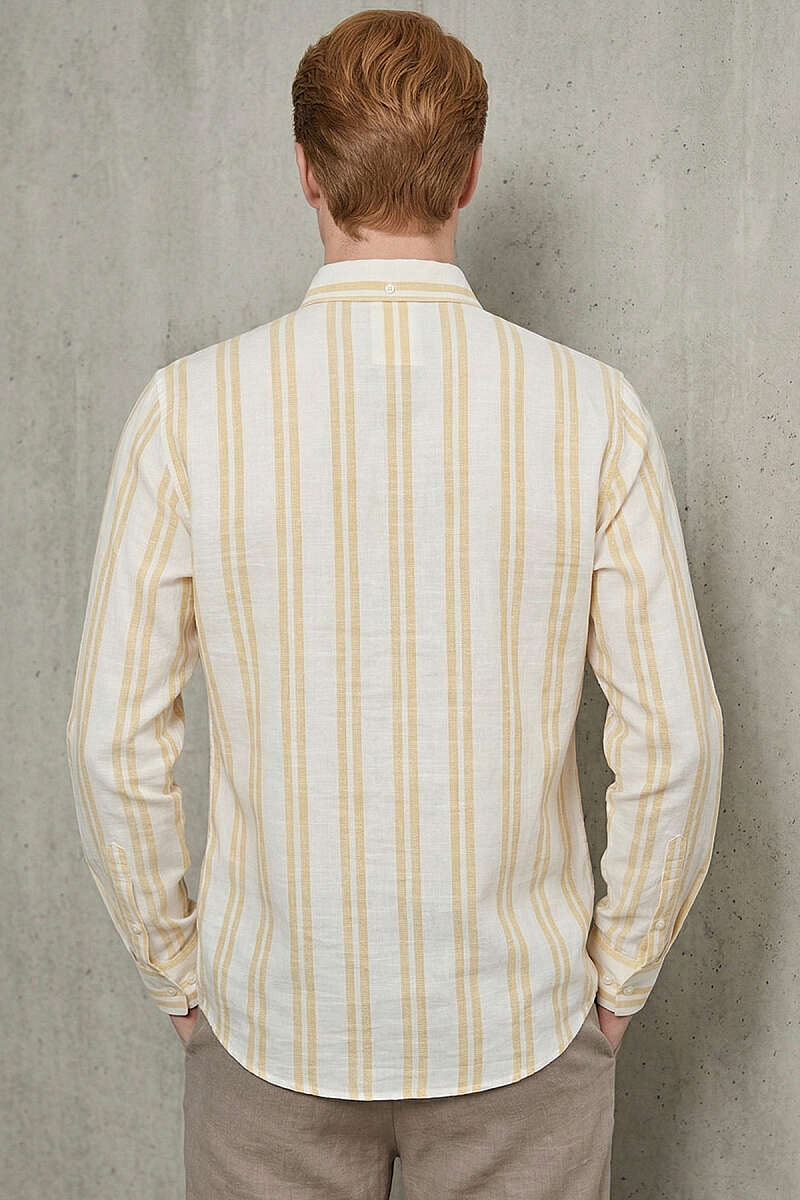 Çizgili Keten Erkek Gömlek Sarı