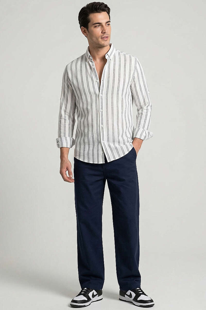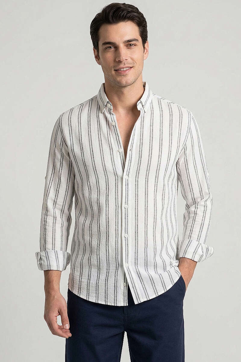 Çizgili Keten Erkek Gömlek Lacivert