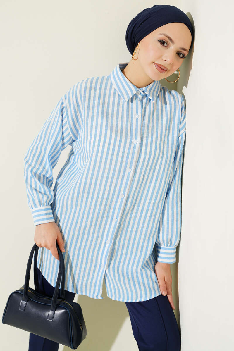 Çizgili Keten Görünümlü Gömlek Mavi