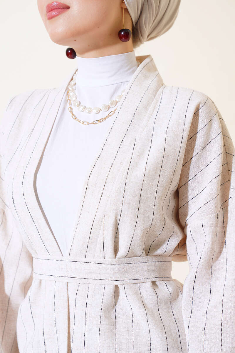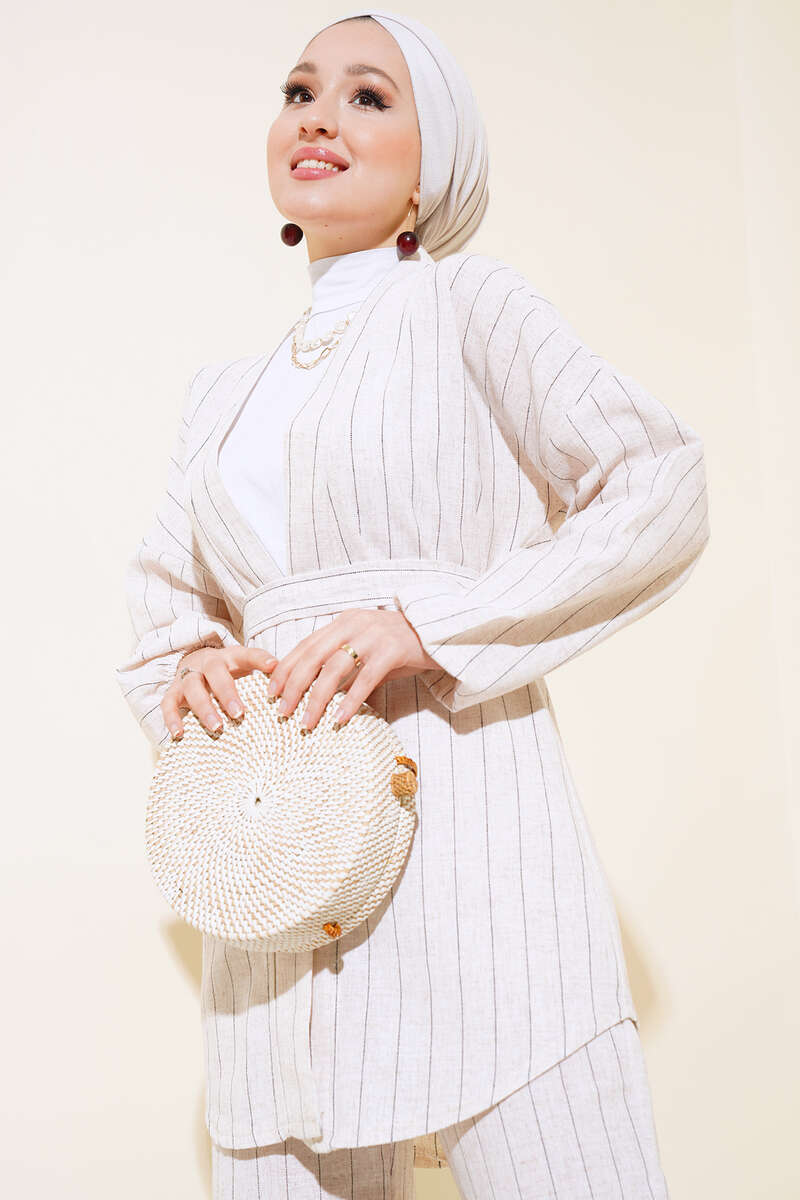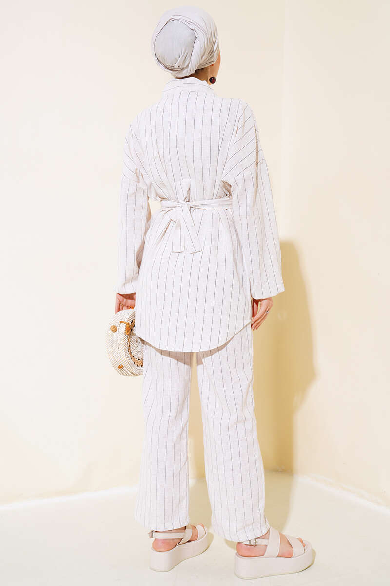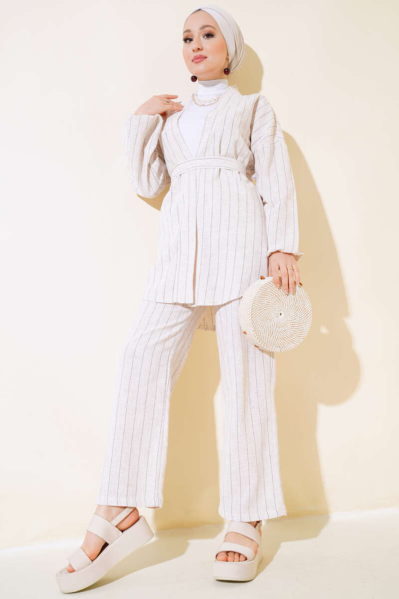 Yeni sezon ikili takım modelimiz sizlerledir. Hırkamız salaş modeldir. Belden kuşaklıdır. Kol bilekleri lastiklidir. Pantolonumuzun beli lastiklidir. İki adet cebi bulunmaktadır. Geniş paça modeldir. Çizgili takım modelimiz keten kumaştır.