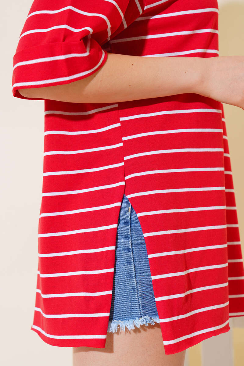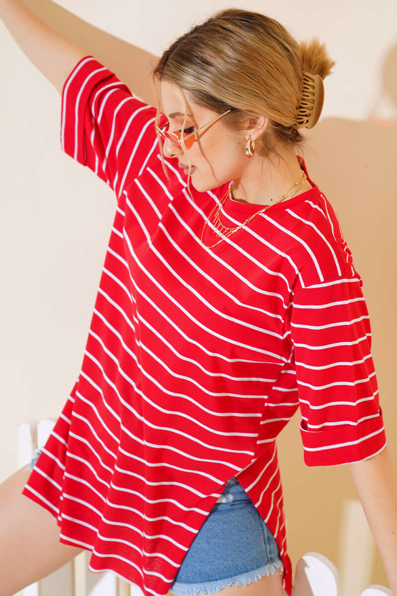 Bu yaz tarzıyla fark yaratan tshirtümüz çizgili desenleriyle dikkat çekmektedir. Oval yaka olan tshirt modelimizin yanları yırtmaçlıdır. Renk seçenekleri mevcuttur.
