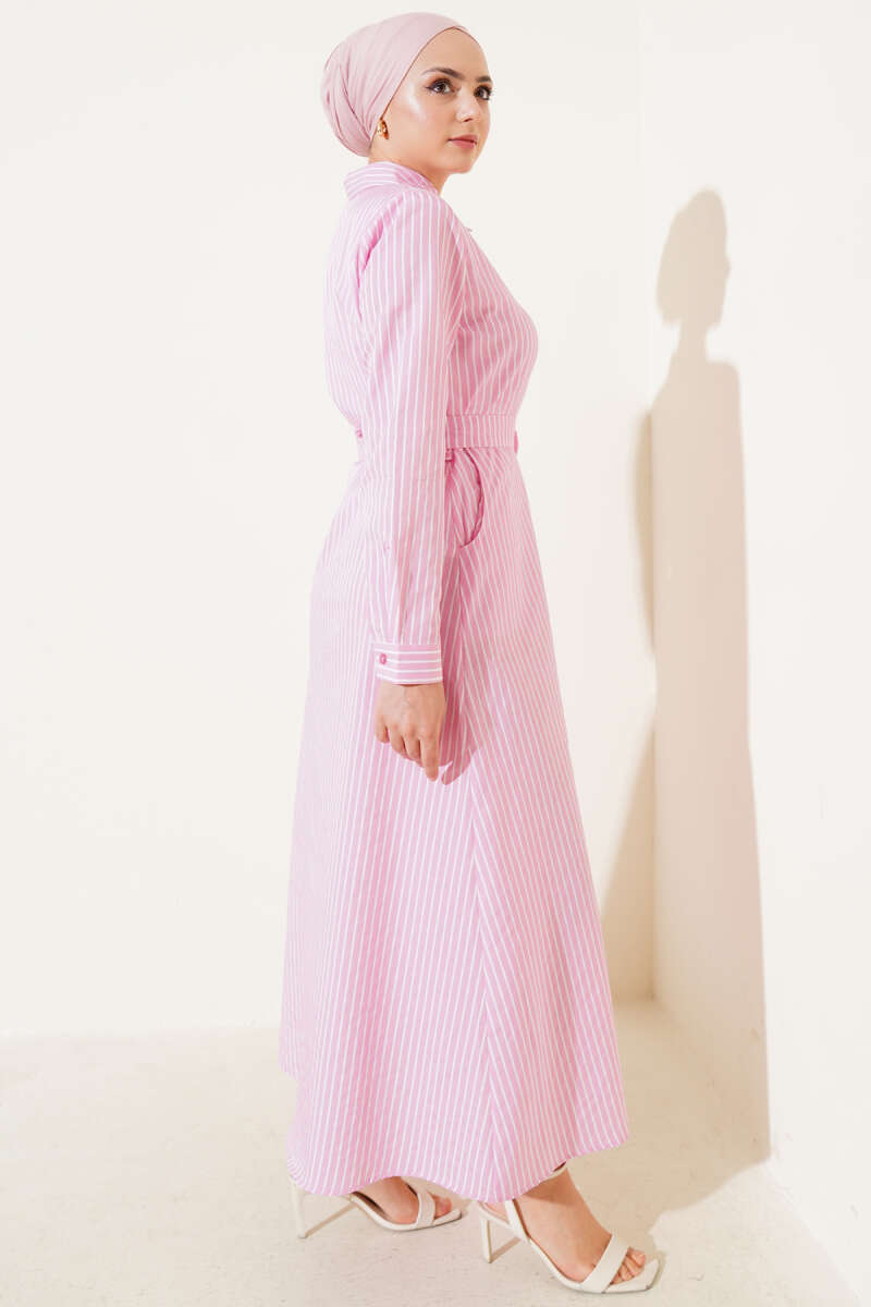 Çizgili Kuşaklı Elbise Pembe