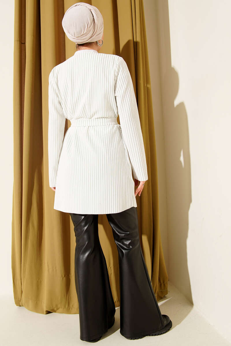 Çizgili Kuşaklı Uzun Hırka Beyaz Yeşil