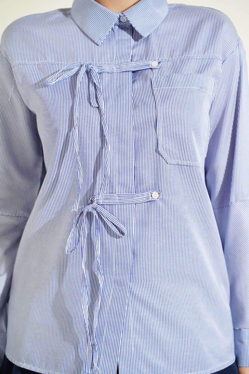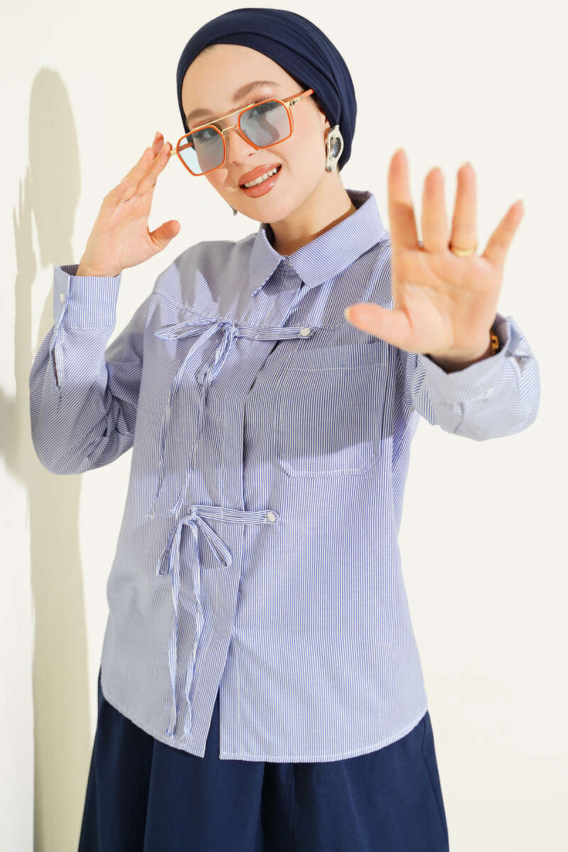 Çizgili Önü İpli Kısa Gömlek Lacivert