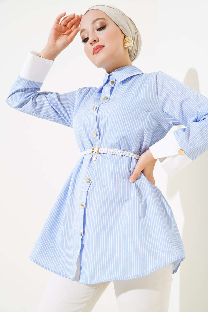 Gizli Düğmeli Bel Kuşaklı Gömlek Bebe Mavi