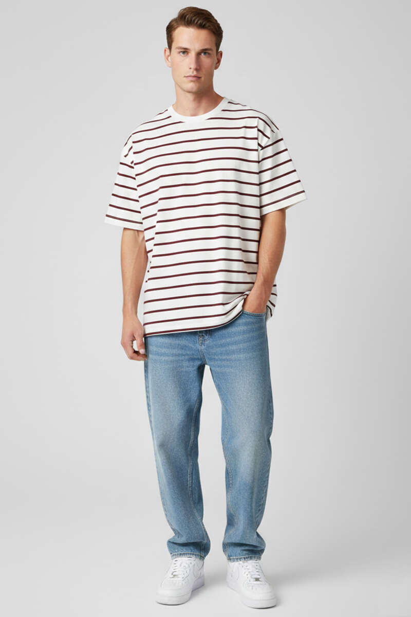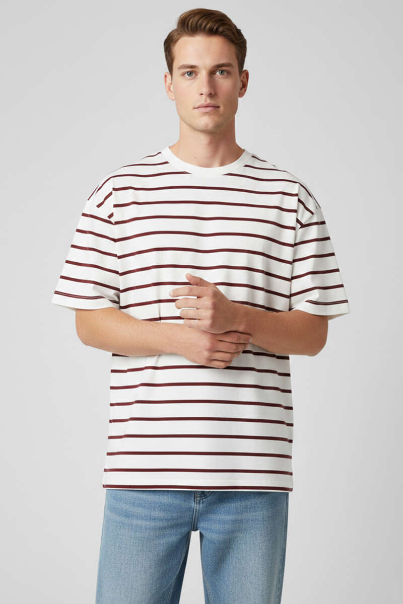 Çizgili Oversize Erkek T-shirt Bordo
