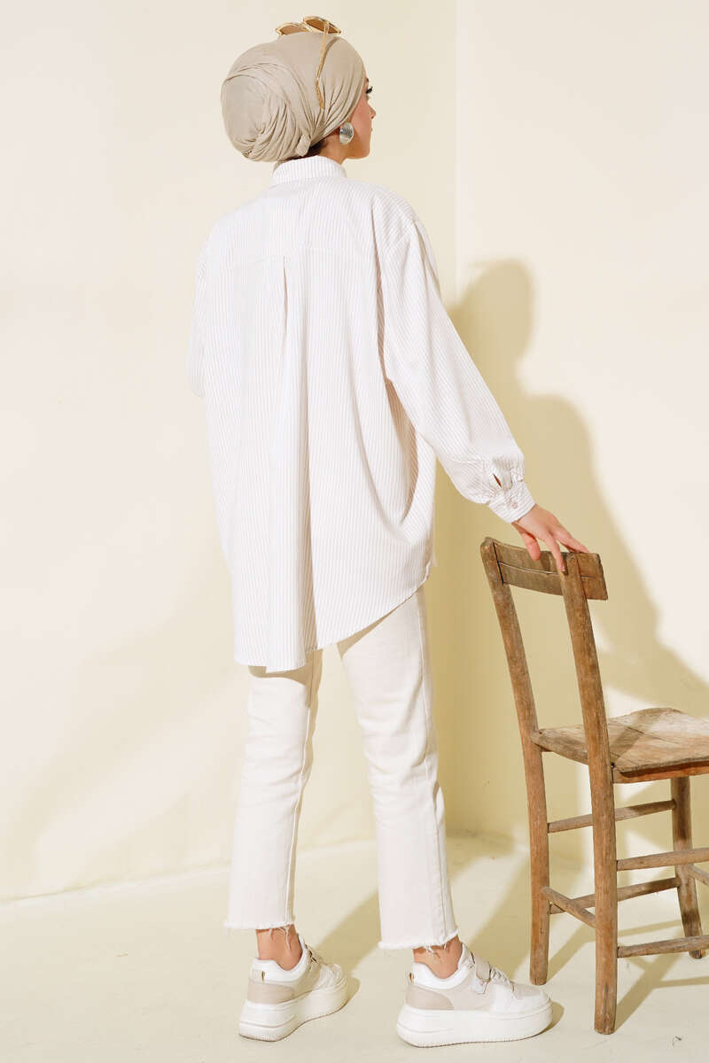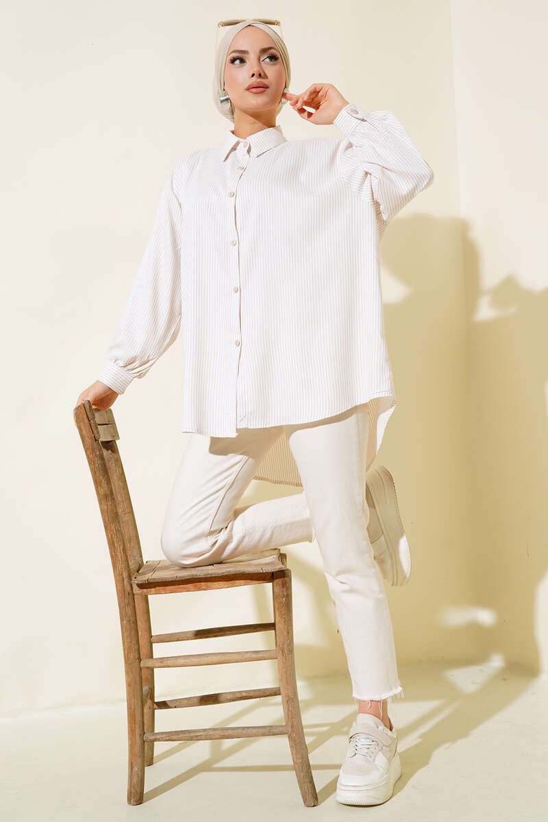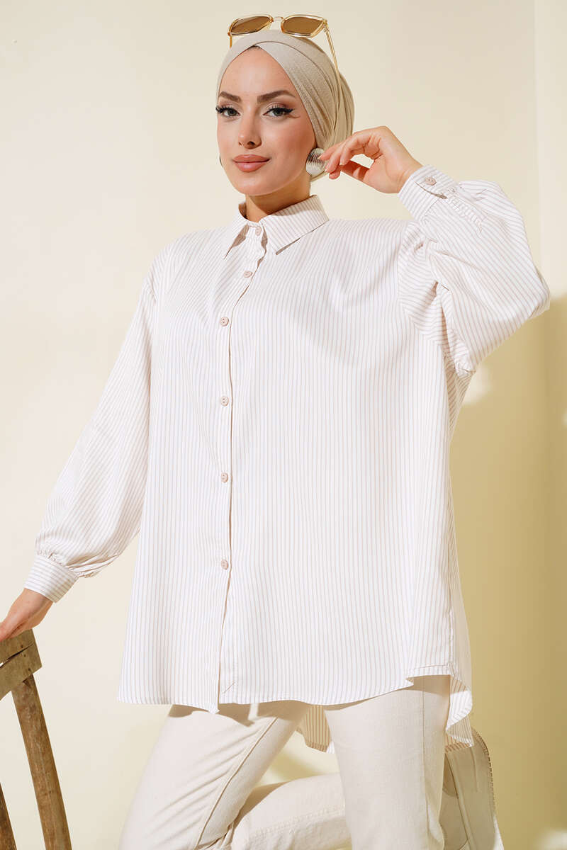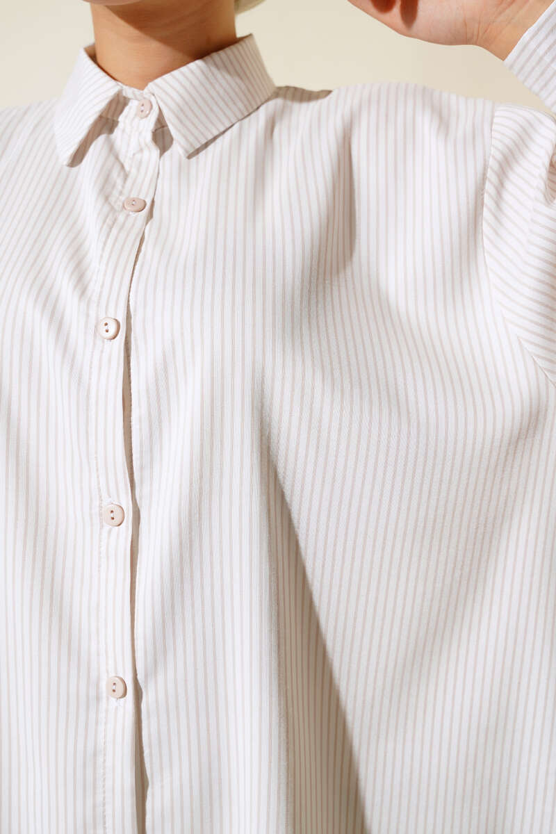 Yeni sezon çizgili gömlek modelimiz sizlerle beraber. Çizgili model olan gömleğimiz oversize modeldir. Boydan düğmelidir. Önü arkasına göre kısa modeldir.
