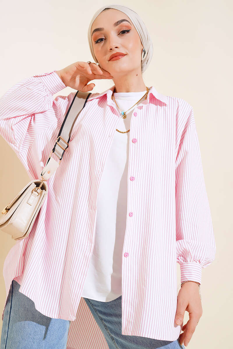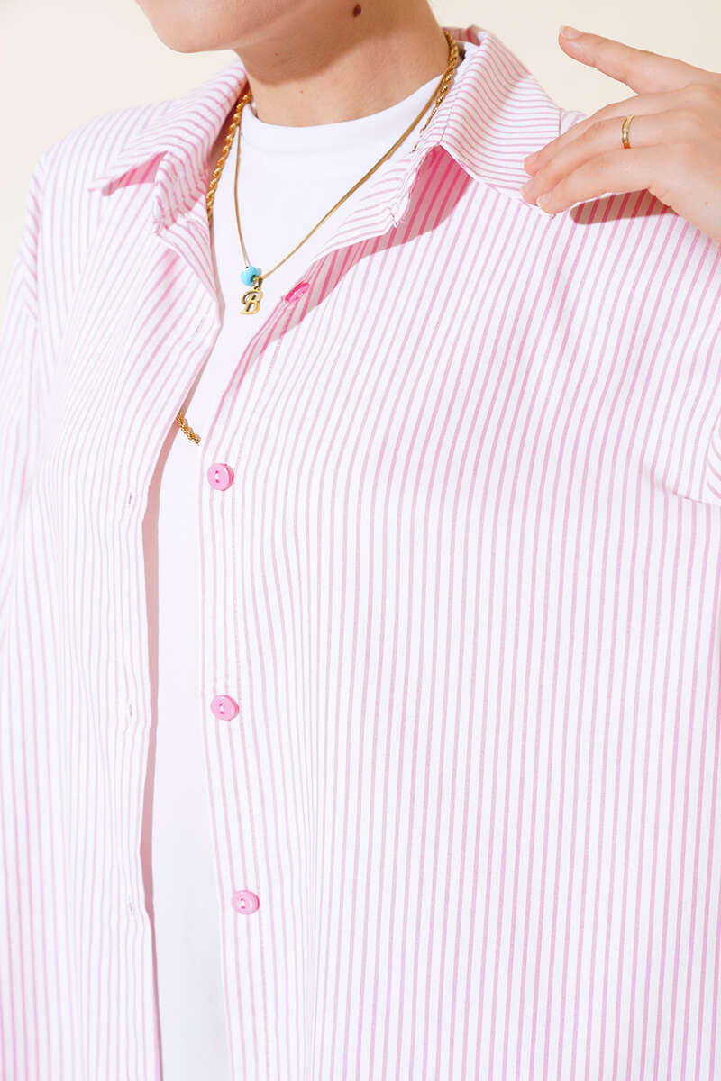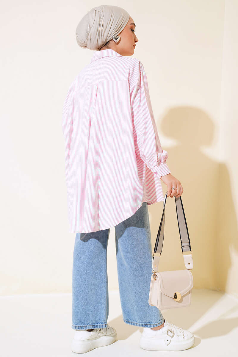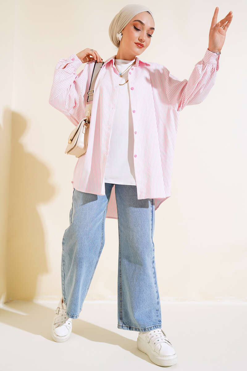 Çizgili Oversize Gömlek Beyaz Pembe
