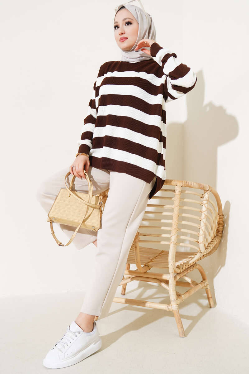Gömlek Yaka Çizgili Triko Tunik Kahve