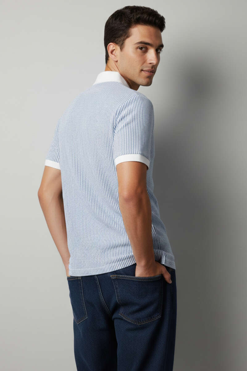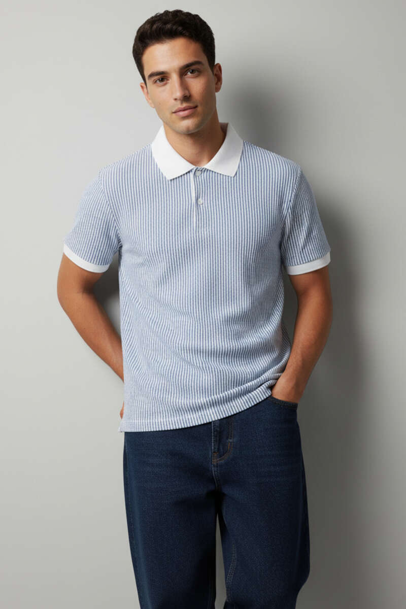 Çizgili Polo Yaka Düğmeli Erkek Tişört Mavi