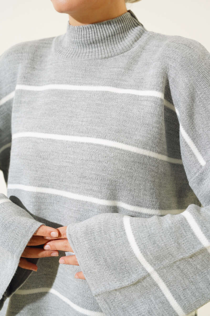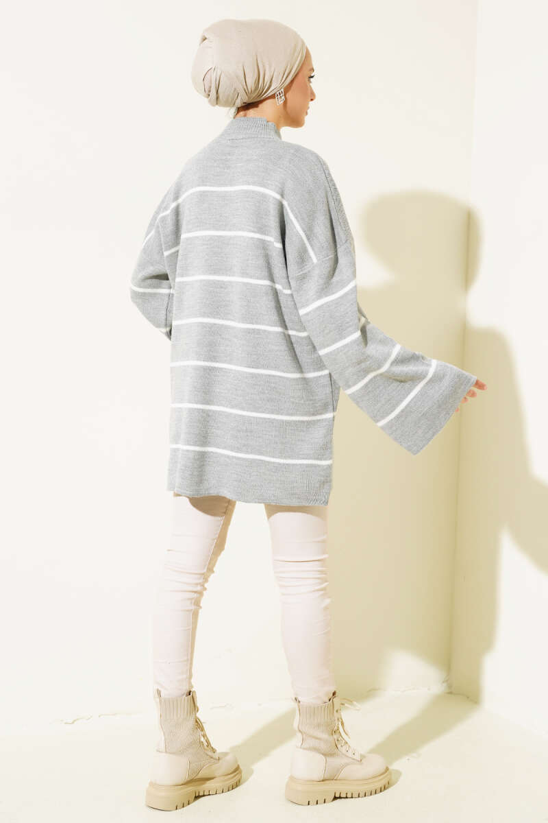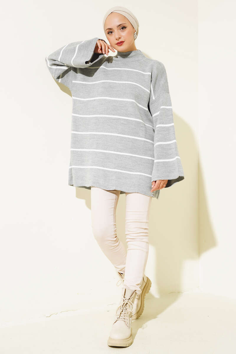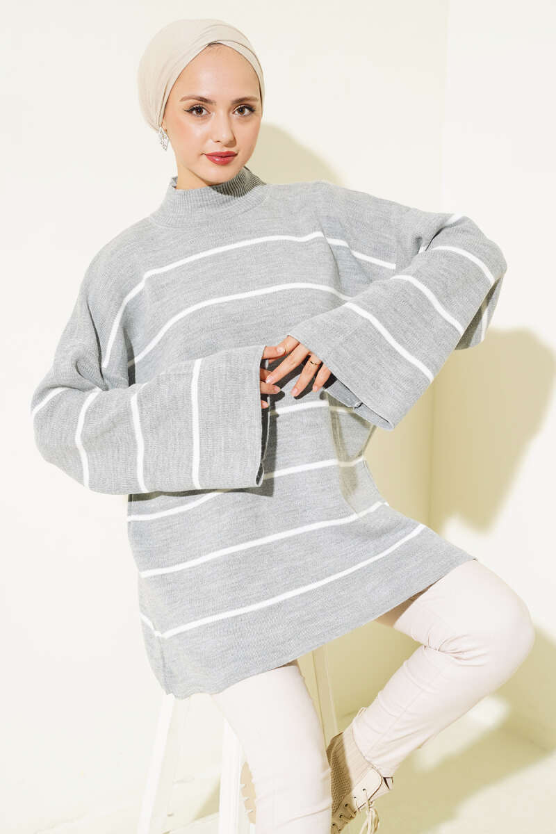 Çizgili Salaş Dik Yaka Triko Tunik Gri