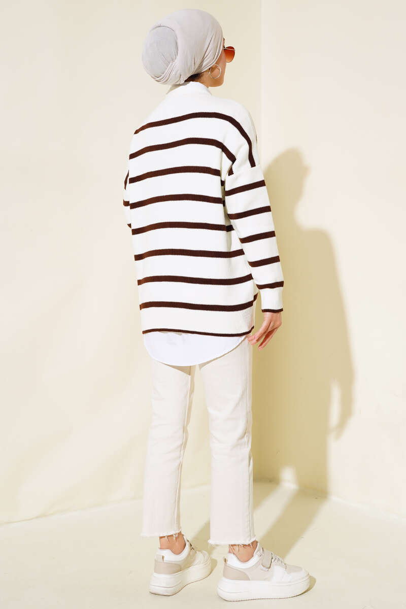 Çizgili Salaş Hırka Ekru Kahve