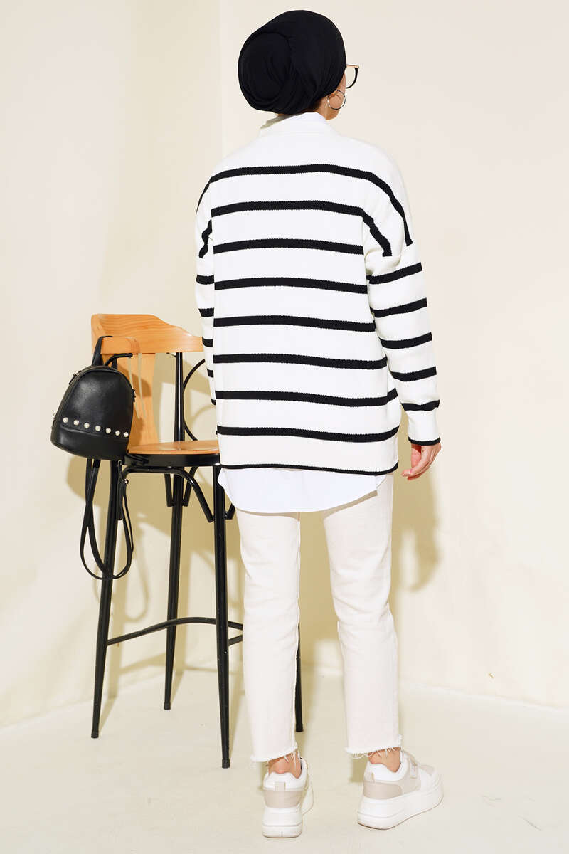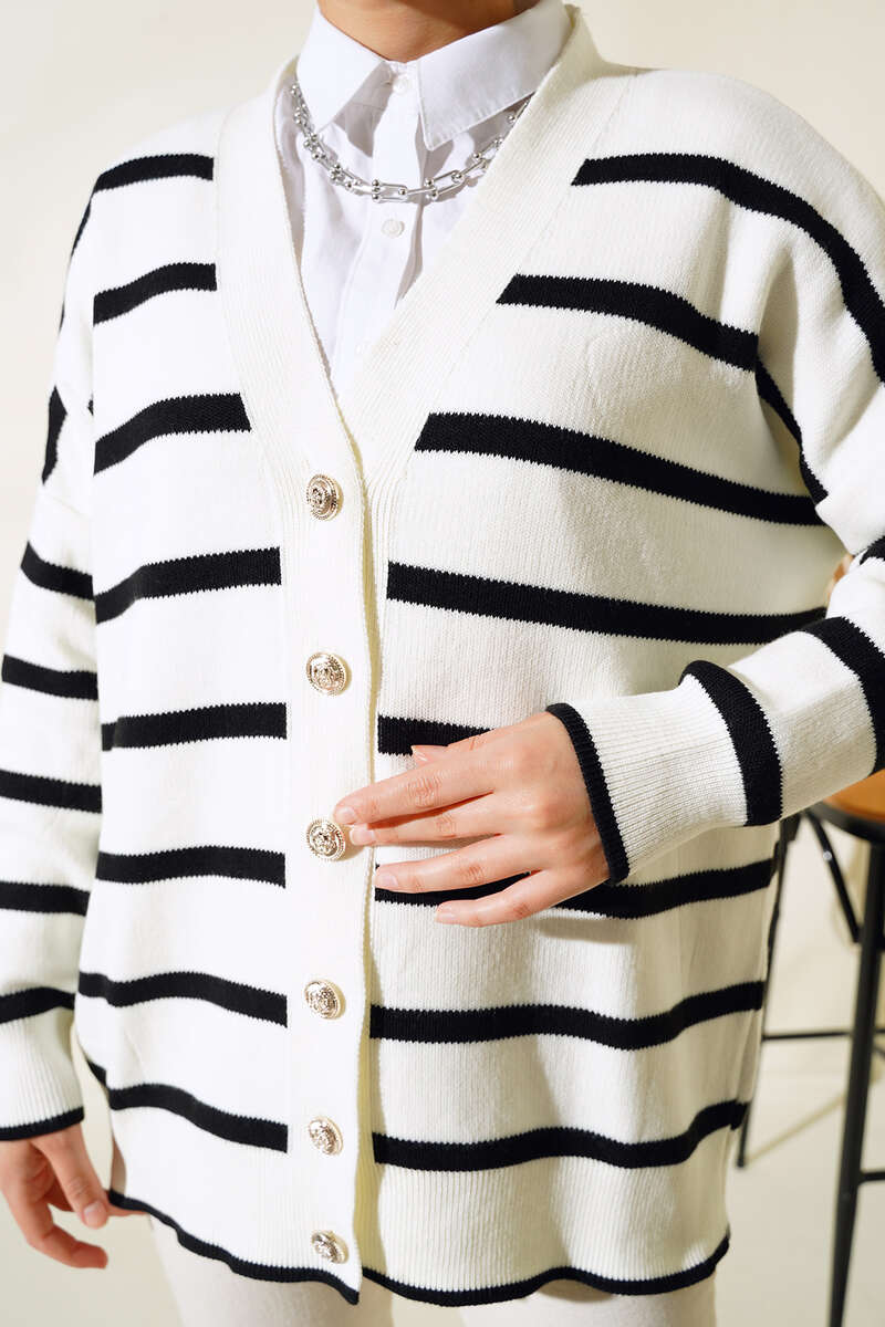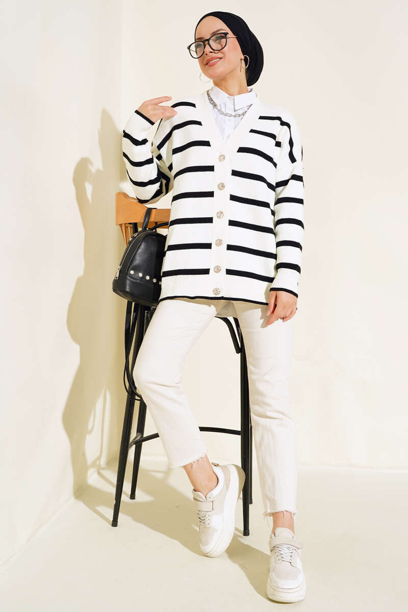 Çizgili Salaş Hırka Ekru Siyah