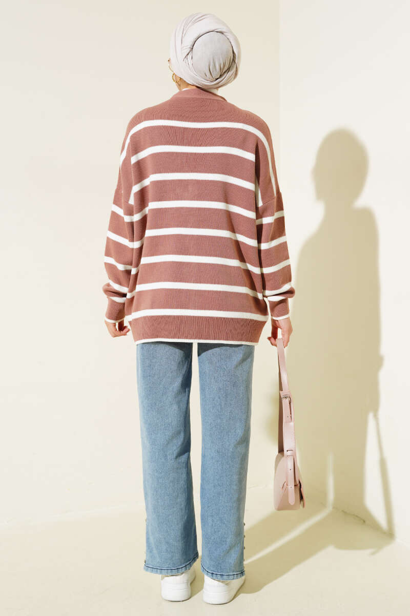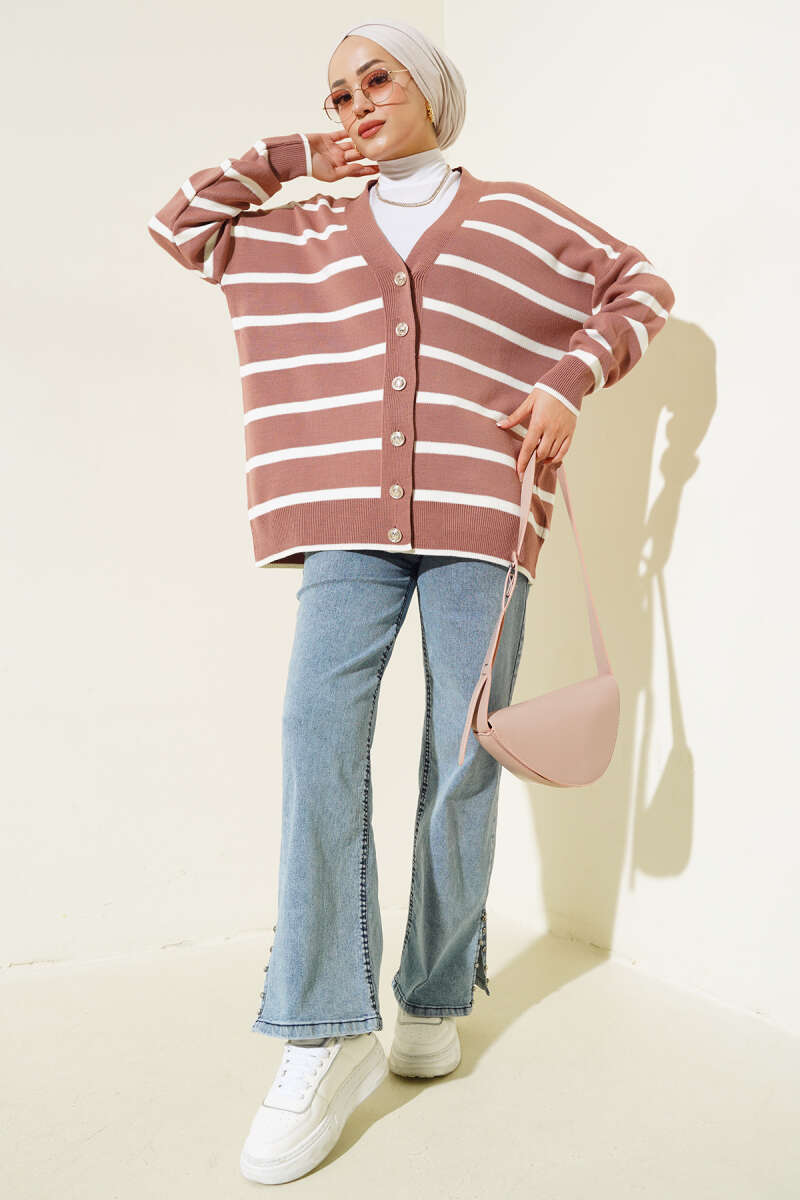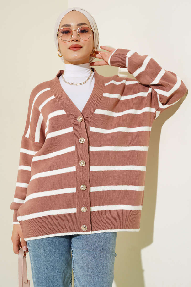 Saç Örgülü Düğmeli Triko Hırka Kahve