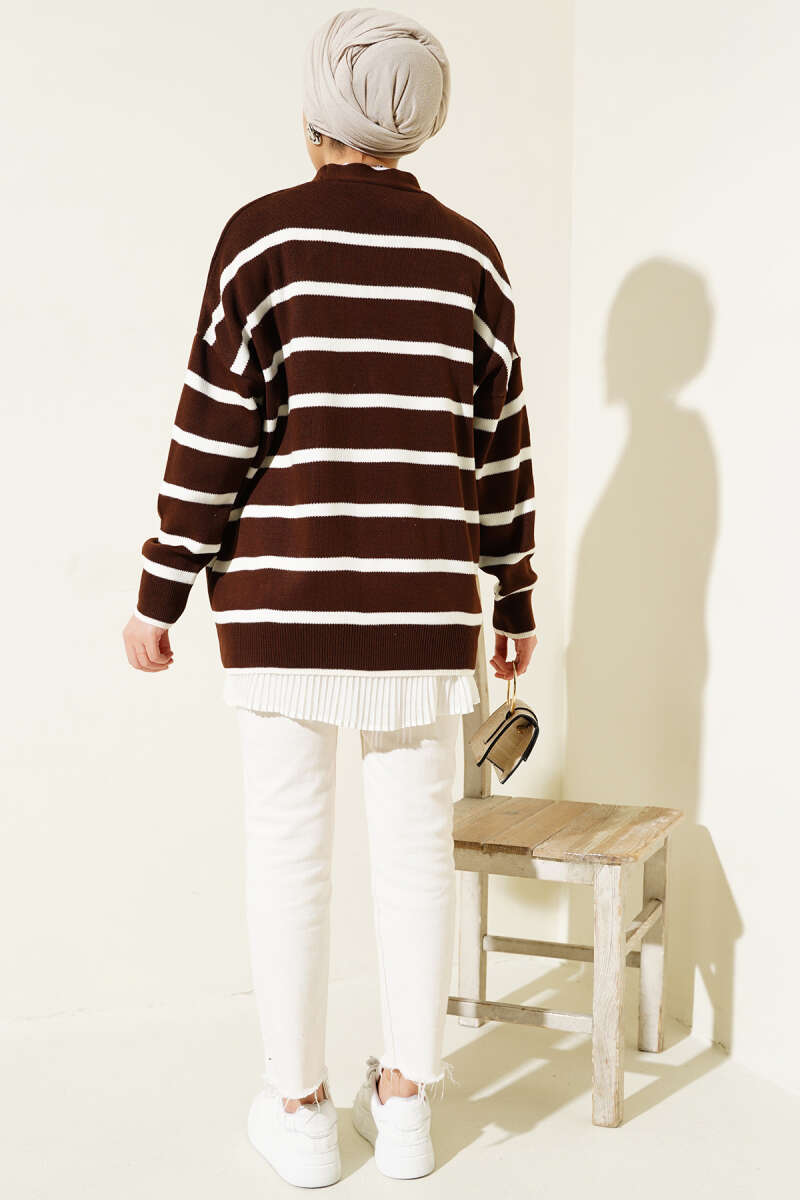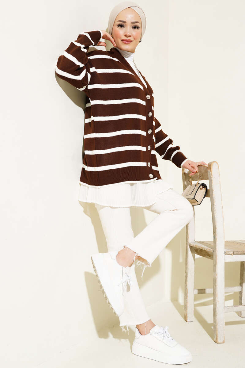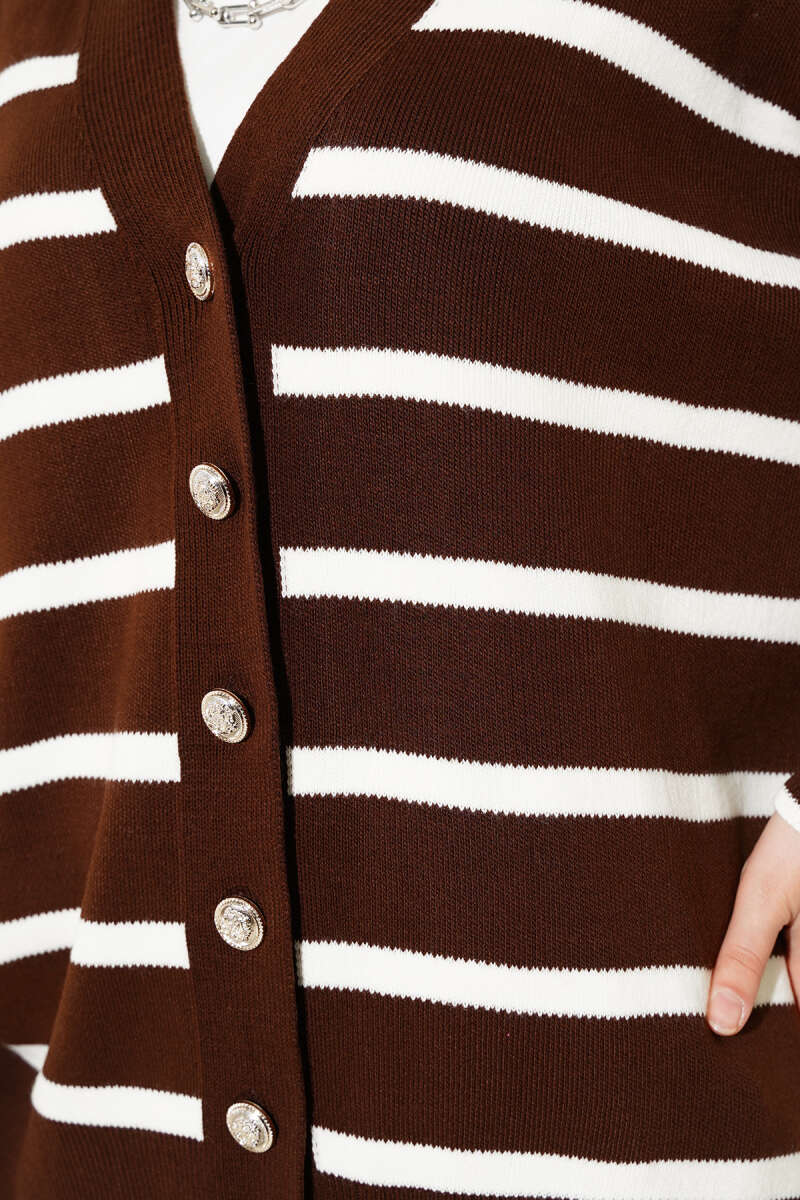 Zikzak Desenli Gold Düğmeli Triko Hırka Kahve
