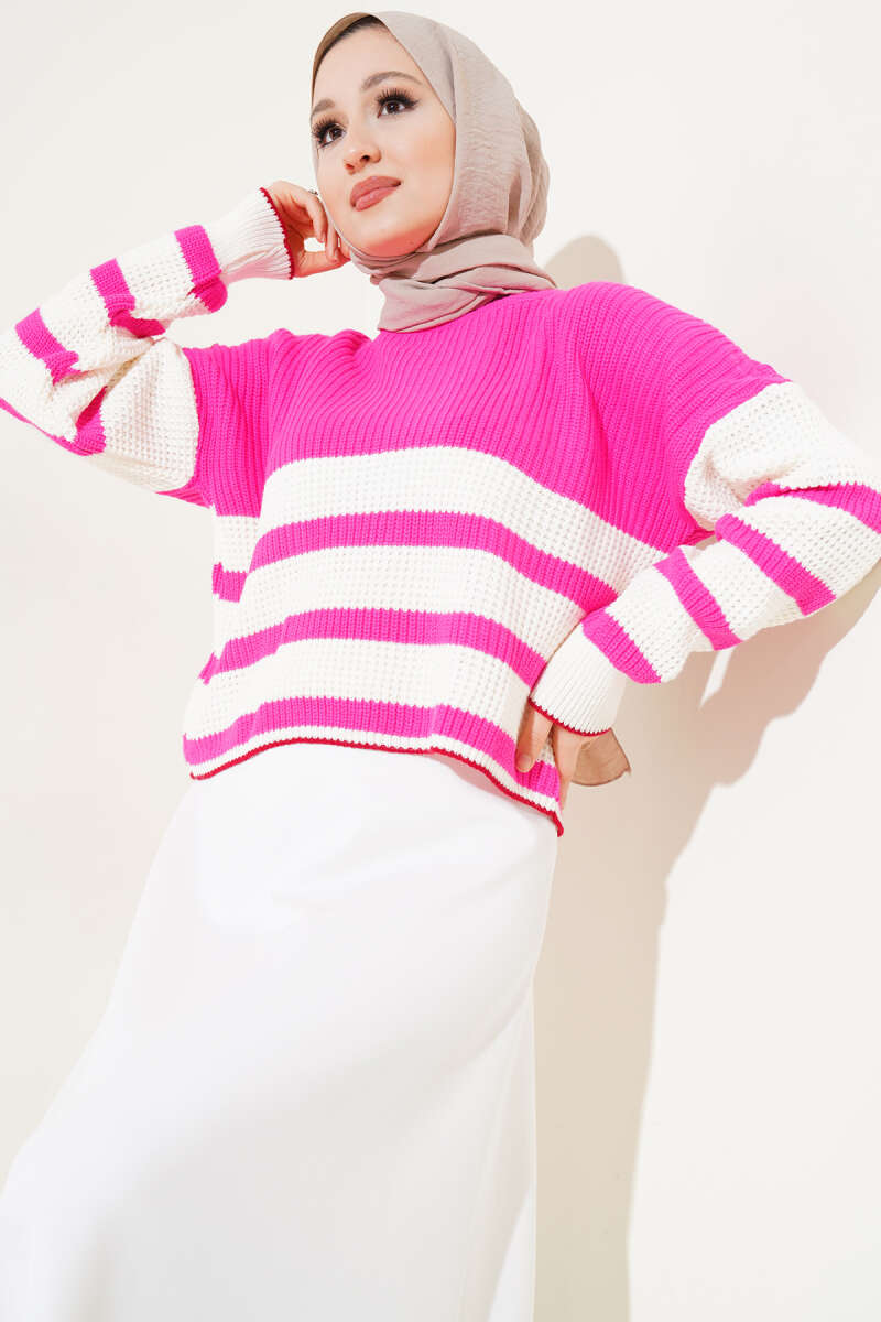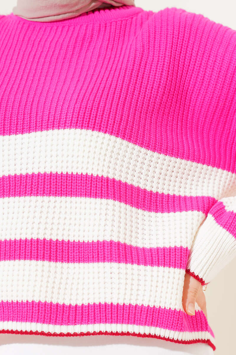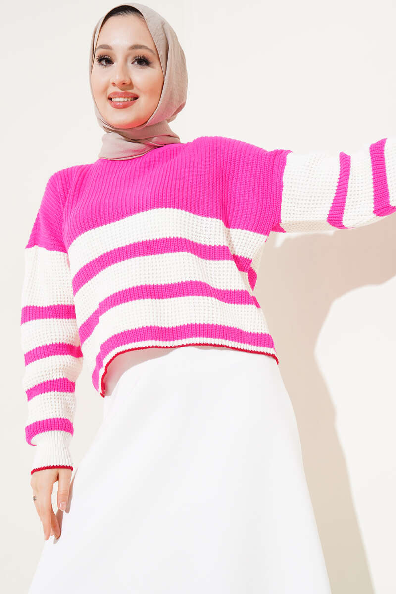 Çizgili Triko Crop Kazak Fuşya