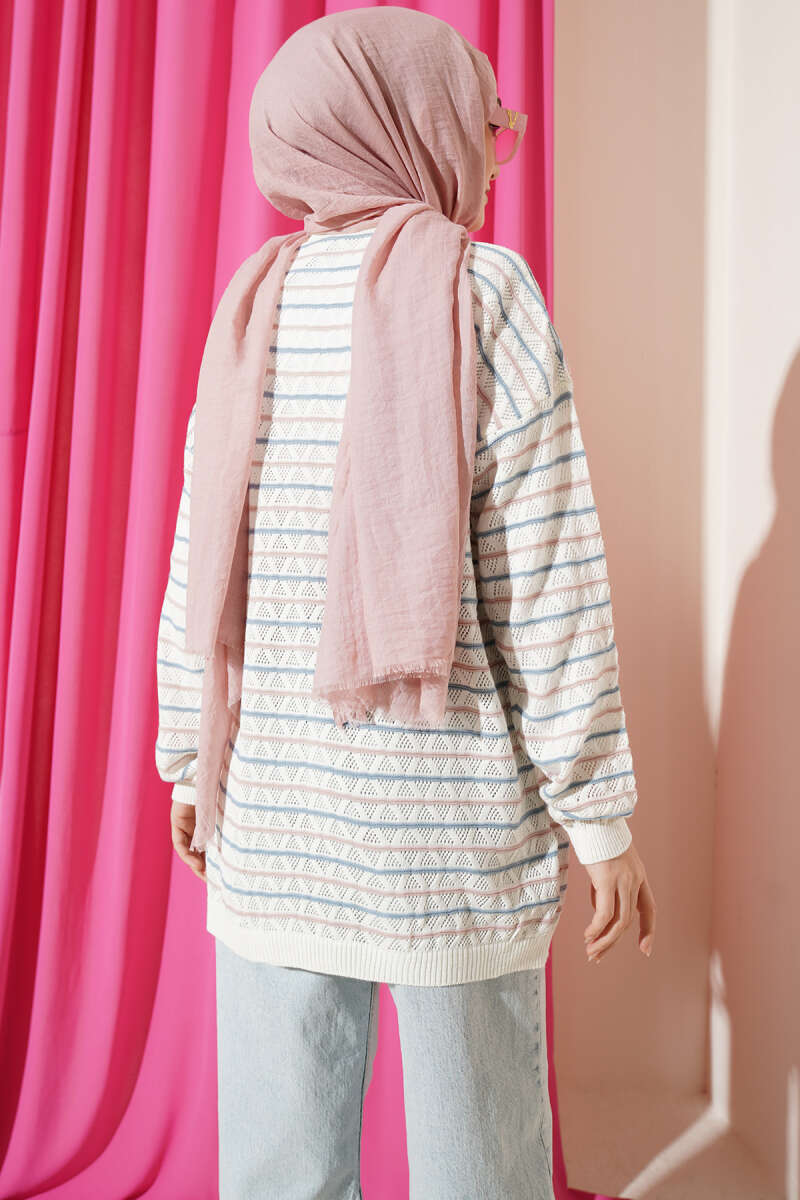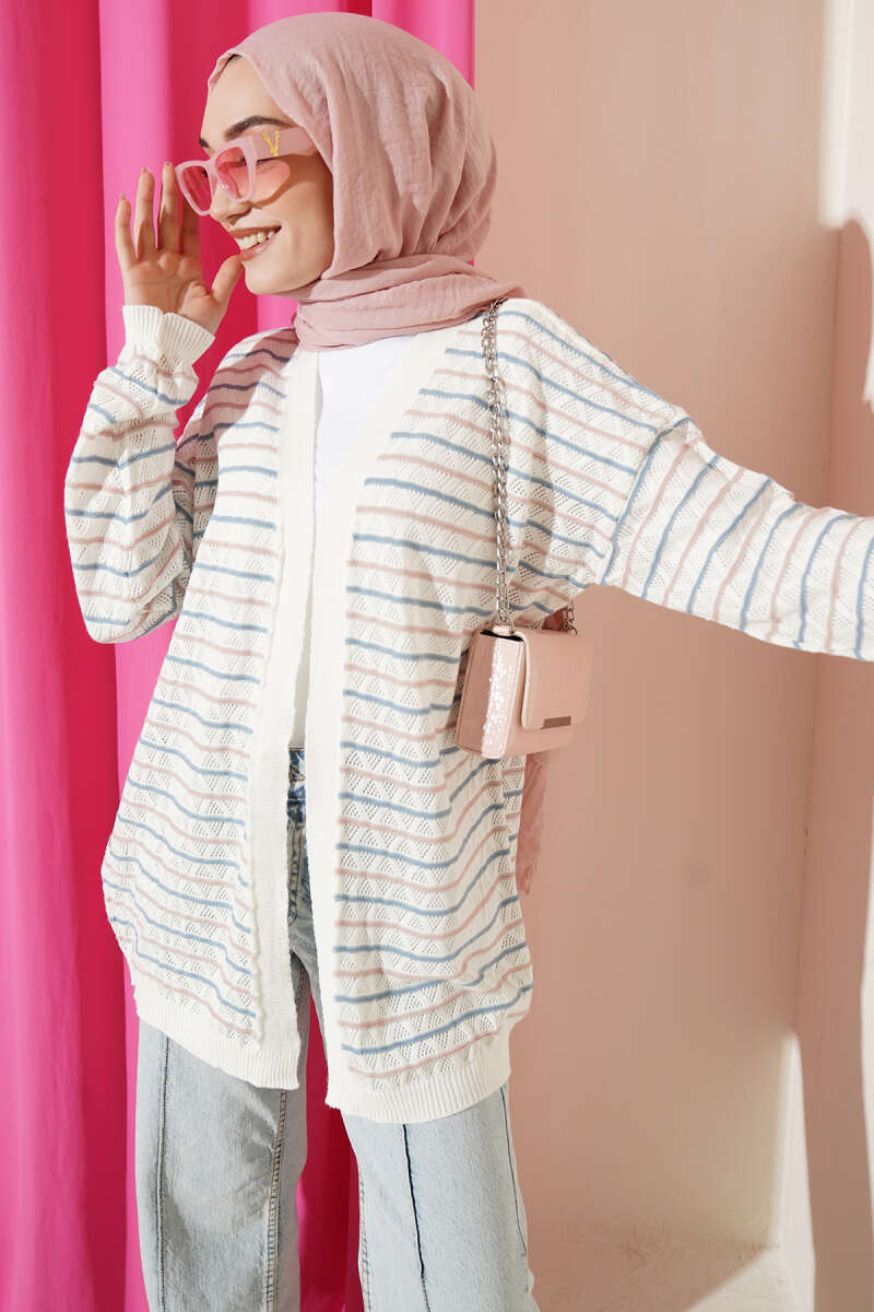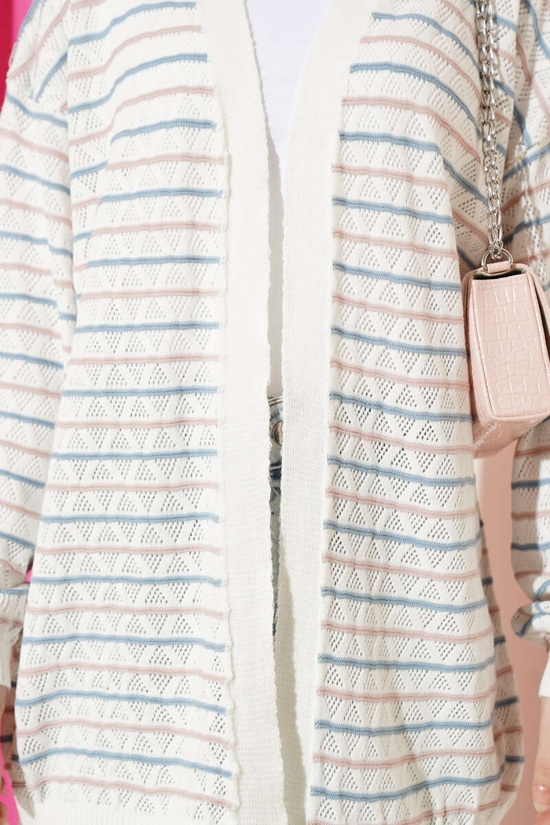 Çizgili Üçgen Ajurlu Triko Hırka Kemik