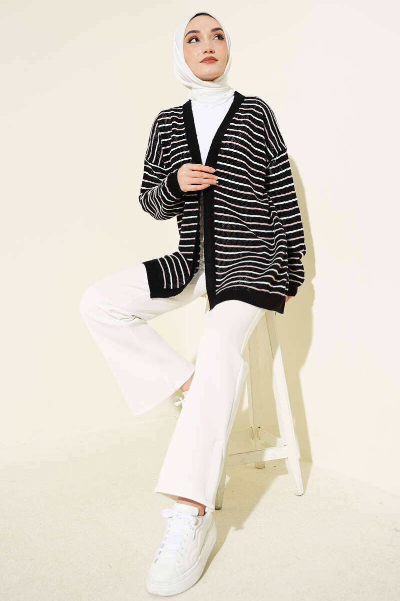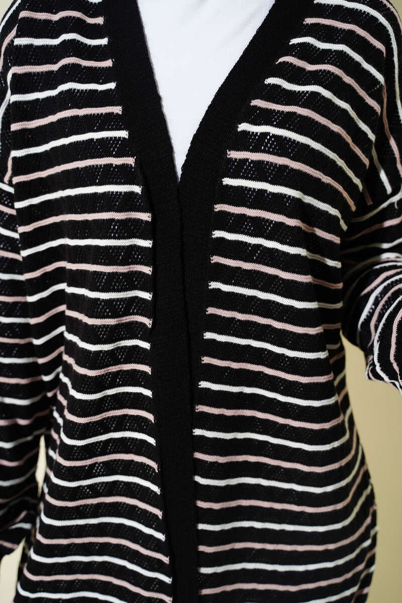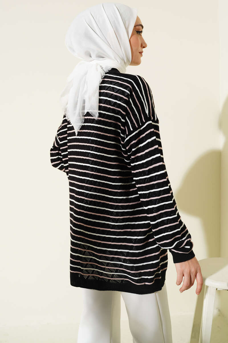 Çizgili Üçgen Ajurlu Triko Hırka Siyah
