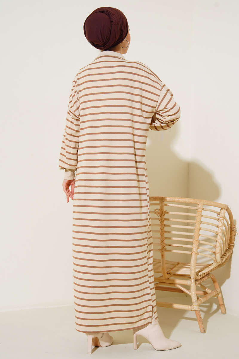 Yeni sezon elbisemiz çizgili modeldir. Gömlek yakaya sahip elbisemizin yaka kısmında halka tokalı yarım fermuar detayı bulunmaktadır. Düşük omuzludur. Bilek kısımları ribanalıdır. Etek uçlarında mini yırtmaç detayı mevcuttur.