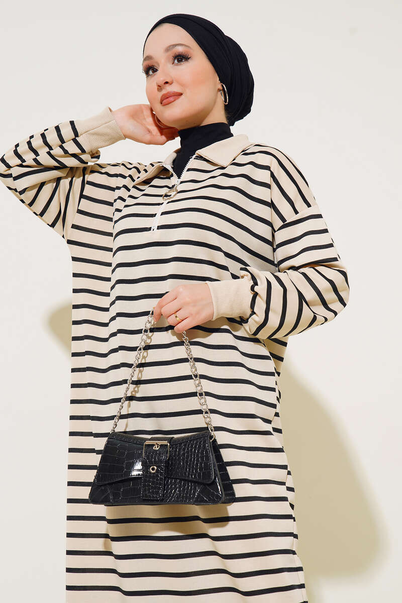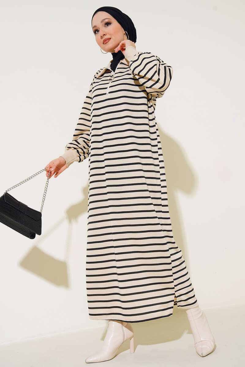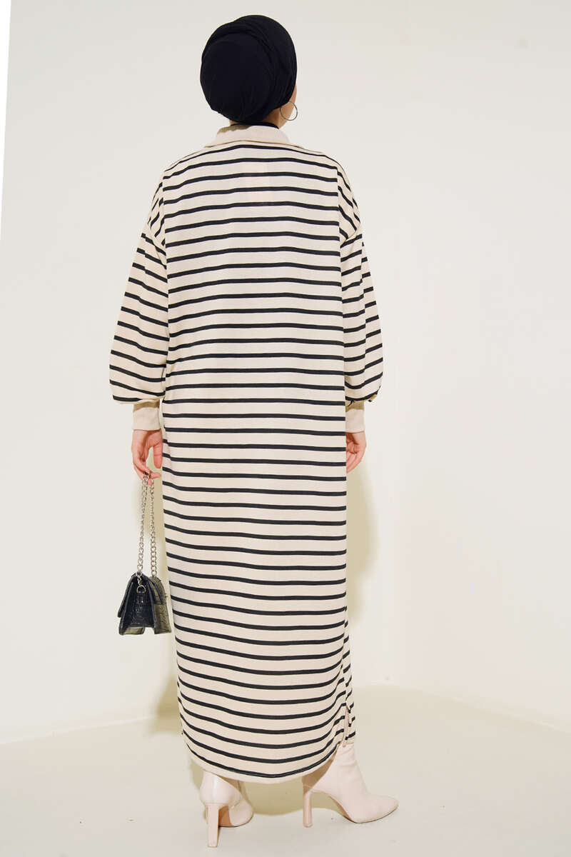 Yeni sezon elbisemiz çizgili modeldir. Gömlek yakaya sahip elbisemizin yaka kısmında halka tokalı yarım fermuar detayı bulunmaktadır. Düşük omuzludur. Bilek kısımları ribanalıdır. Etek uçlarında mini yırtmaç detayı mevcuttur.