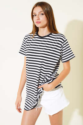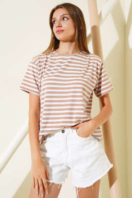 Çizgili Viskon Salaş T-shirt Latte