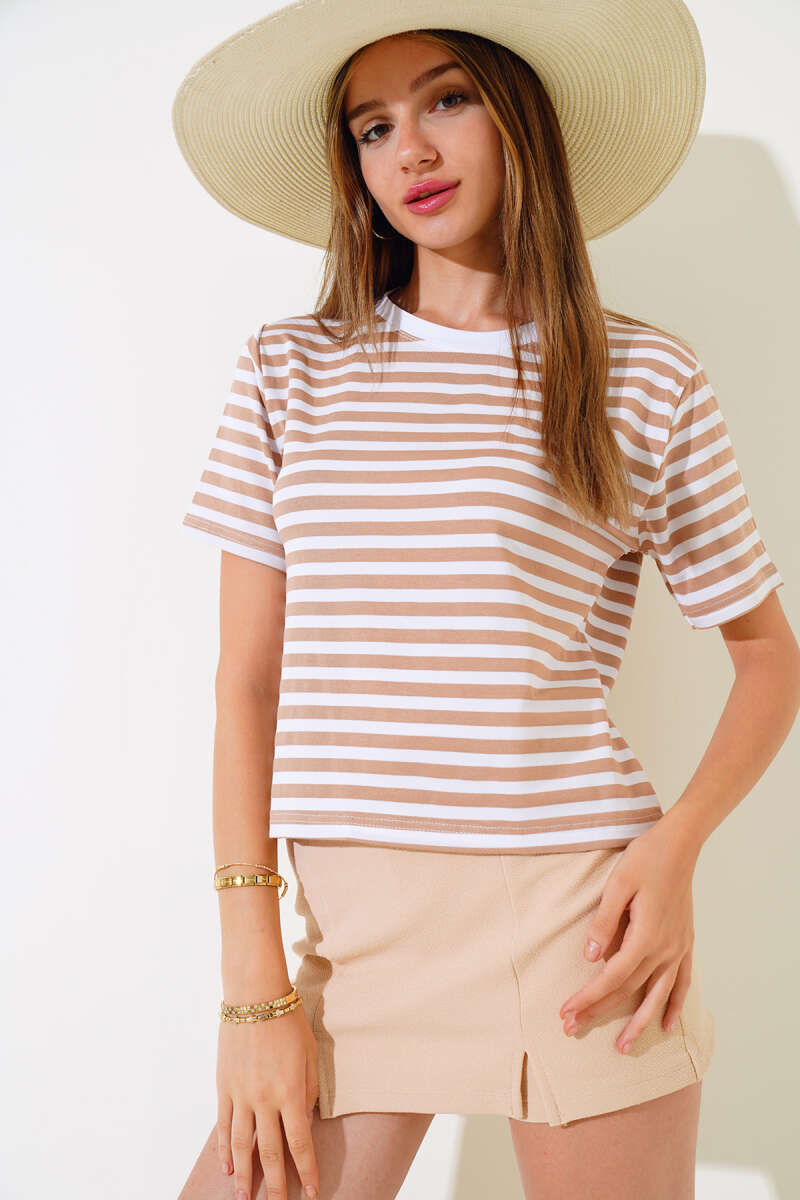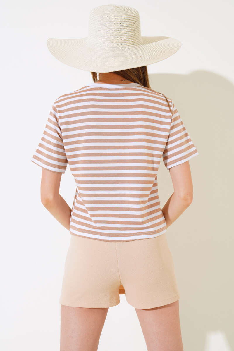 Eteği Volanlı Kısa Kol Triko Bluz Bej