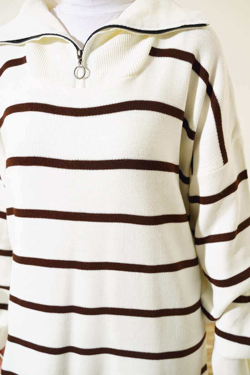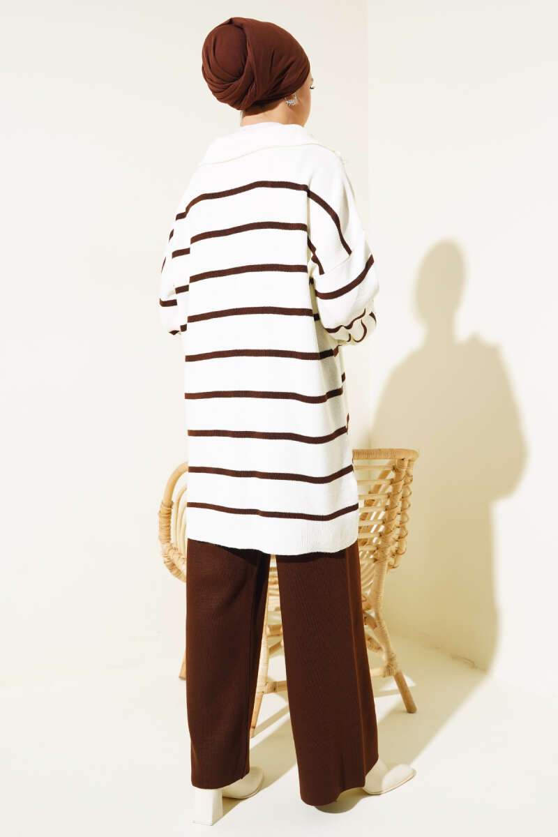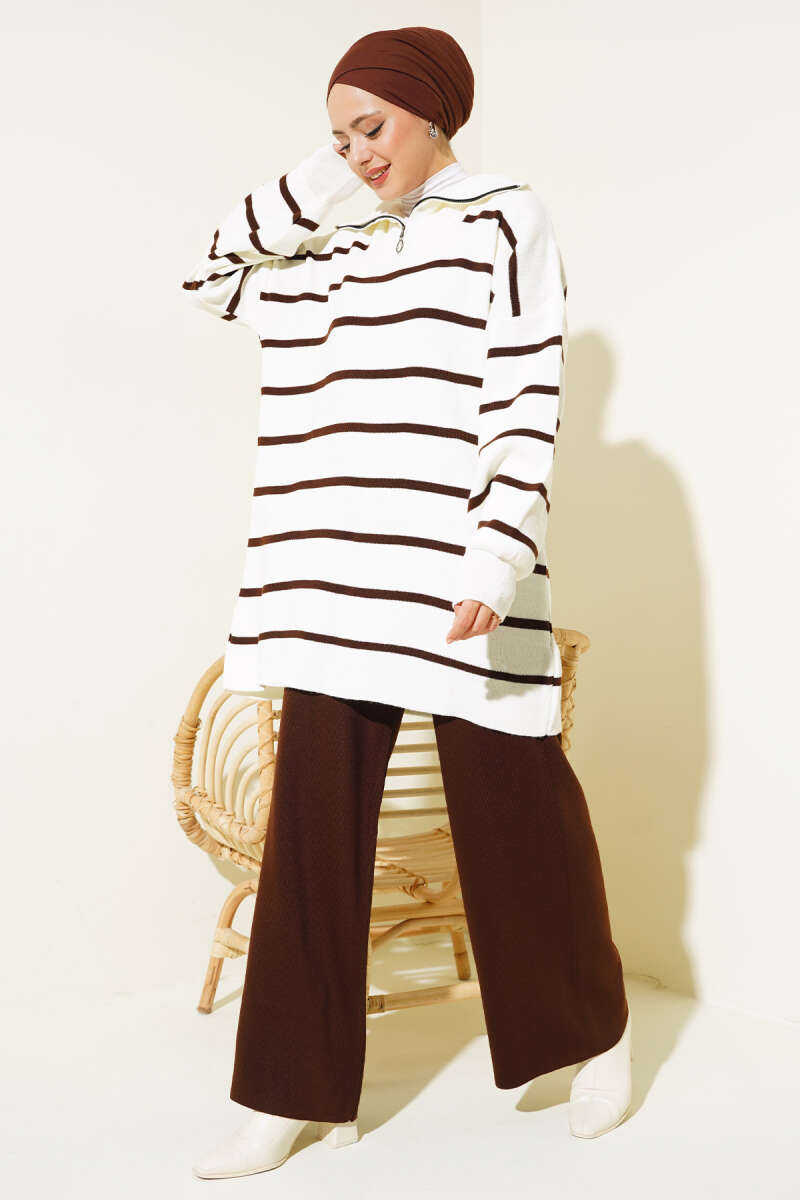 Çizgili Yakası Yarım Fermuarlı Triko İkili Takım Kahve